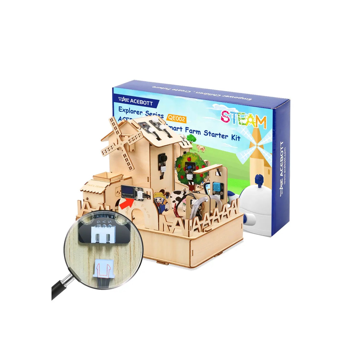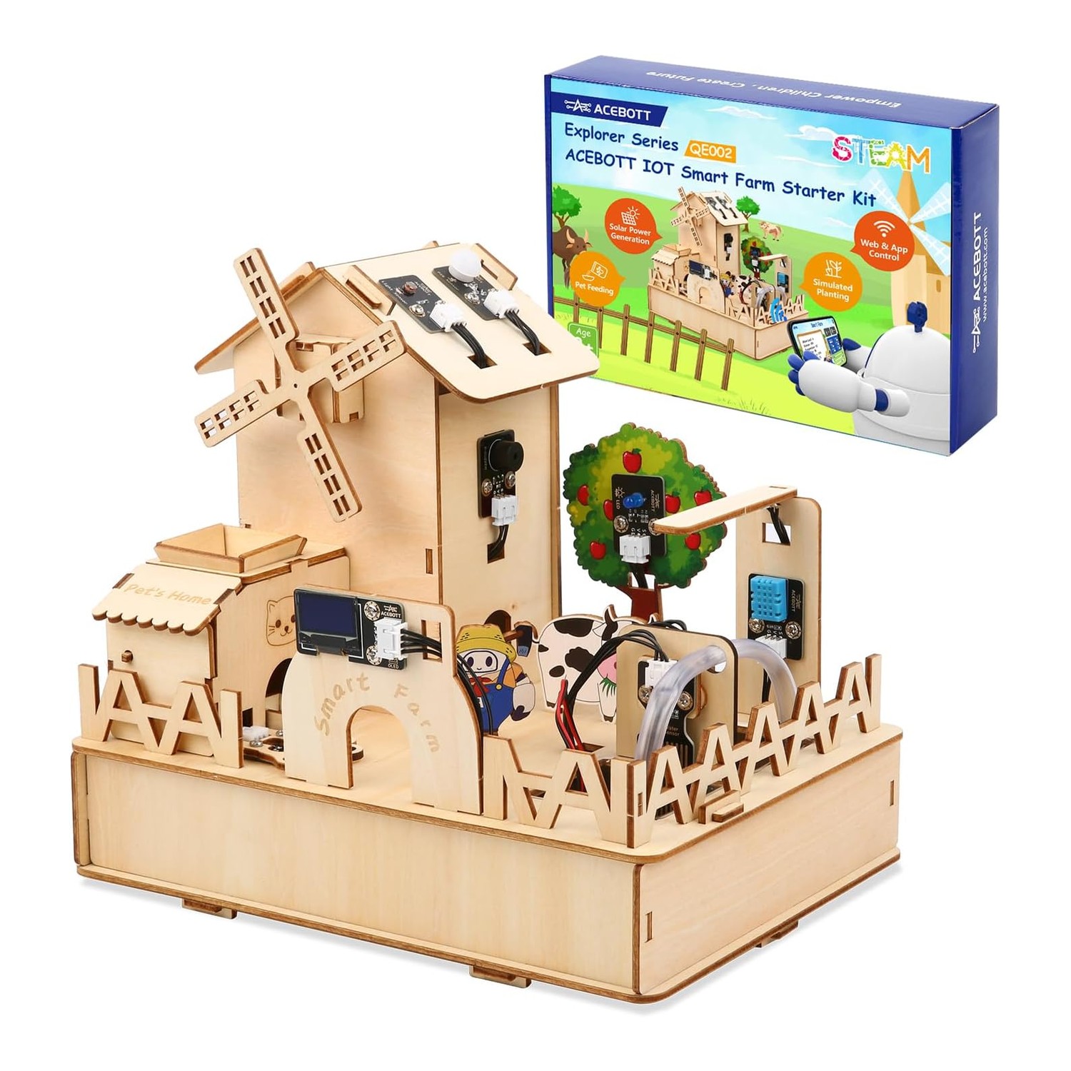 Zestaw ACEBOTT QE002 Zestaw Startowy Smart Farm ESP32 (IoT) to kompleksowy komplet edukacyjny przeznaczony do nauki zasad inteligentnego rolnictwa, systemów IoT oraz programowania mikrokontrolerów. Dzięki gotowym modułom i elementom montażowym użytkownik może zbudować funkcjonalny model farmy, który pozwala na monitorowanie środowiska, automatyzację nawadniania oraz zdalne sterowanie przez aplikację i sieć Wi‑Fi.