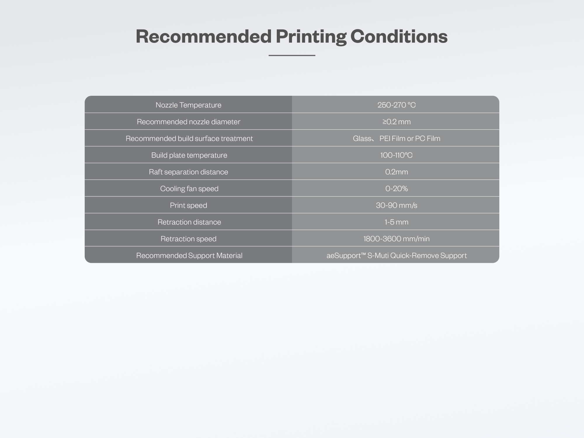 aeWorthy™ ASA-GF to wysokowytrzymały materiał typu ASA o doskonałych właściwościach mechanicznych. Wytrzymałość na rozciąganie jego części do druku 3D w kierunku XY może osiągnąć 40MPa. Dzięki dodaniu ciętego włókna szklanego znacznie poprawiła się jego zdolność do przeciwdziałania odkształceniom i stabilność wymiarowa, a materiał ASA ma doskonałe właściwości przeciw starzeniu się w promieniach UV, co bardzo dobrze nadaje się do drukowania modeli o dużych rozmiarach i zastosowań zewnętrznych.