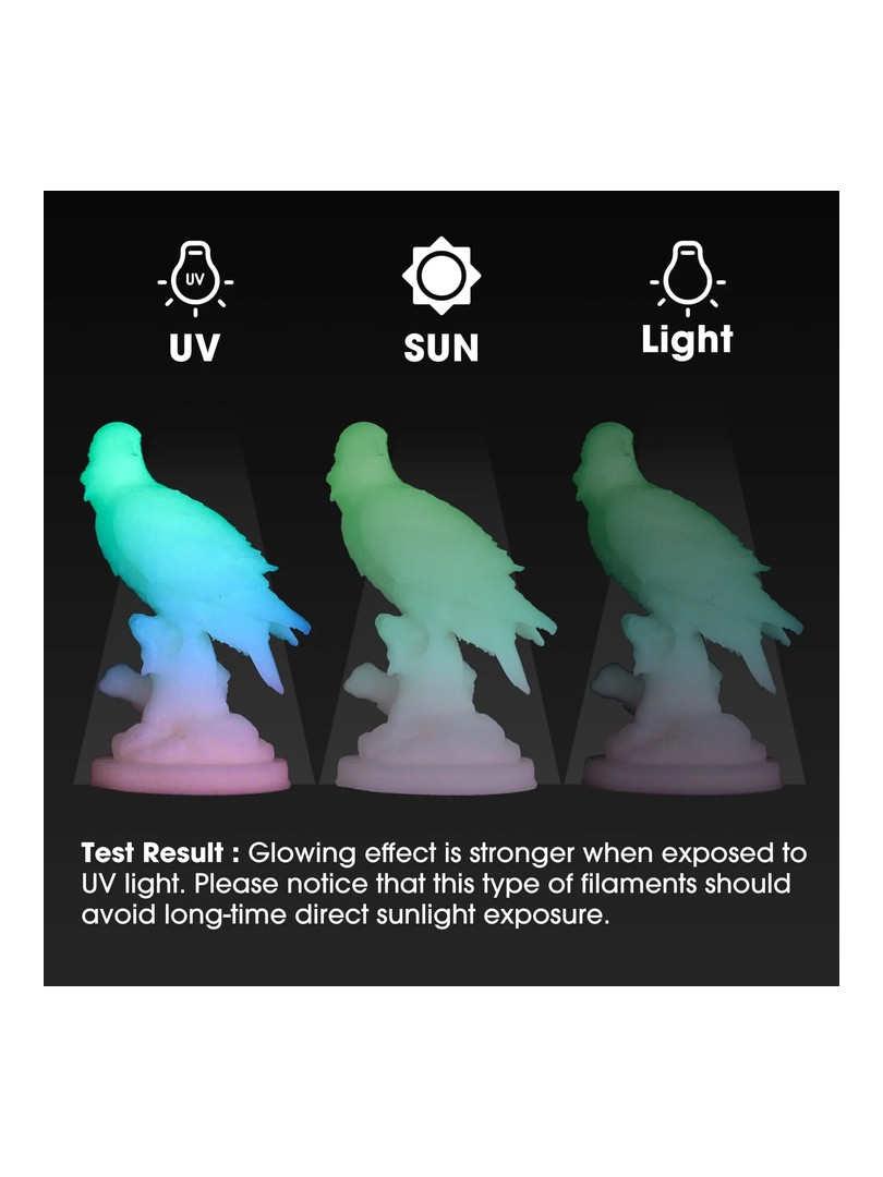 Efekt świetlny PLA Luminous zależy od intensywności i czasu działania źródła światła. Im dłuższy czas naświetlania, tym lepszy efekt świetlny.