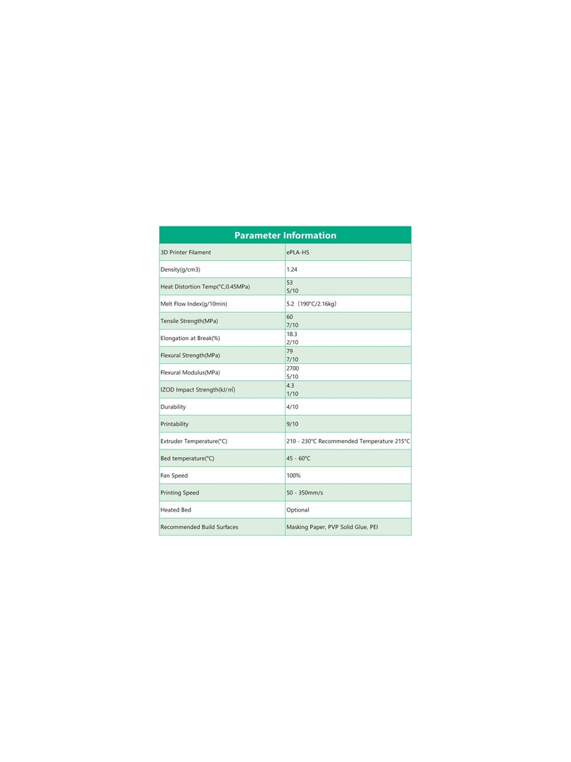 Dzięki zrównoważeniu wskaźnika płynięcia i temperatury topnienia, ePLA-HS (szybki PLA) może płynnie płynąć w stanie stopionym i szybko schładzać się podczas drukowania.