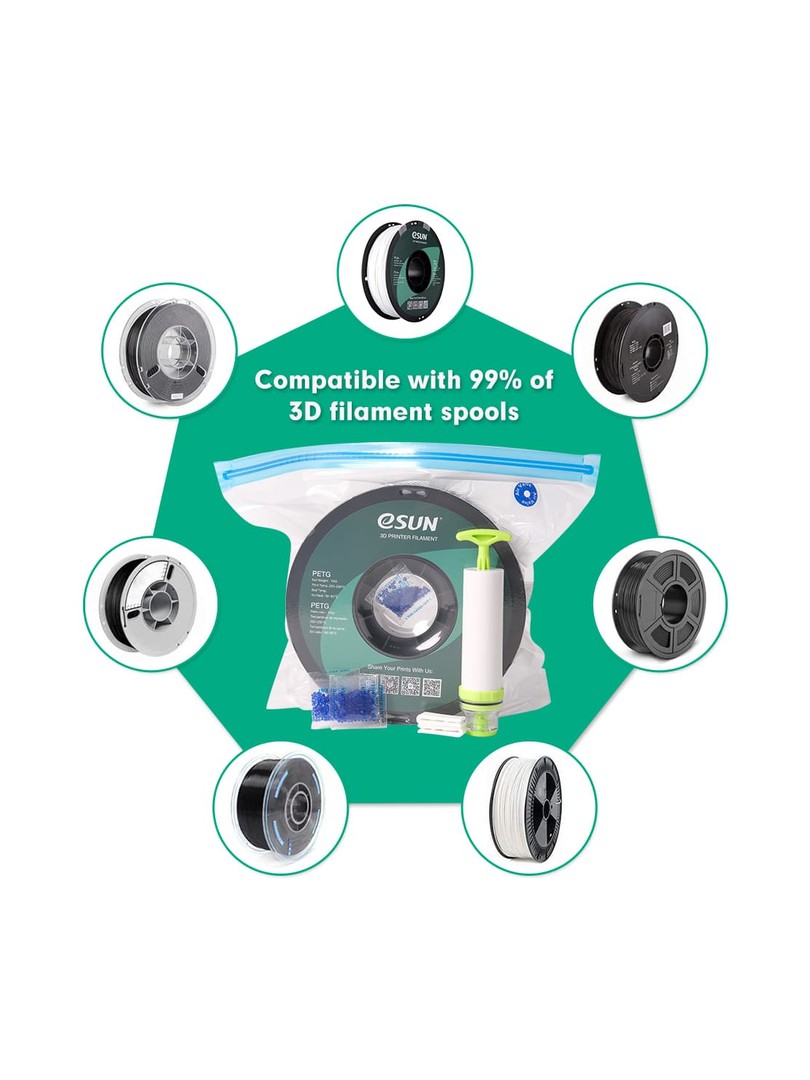 A portable household vacuum device for vacuum storage of consumables, especially consumables with high water absorption. When your consumables are opened and not used up, to prevent the material from getting wet and affecting the print quality, you can use this kit to store your materials. The vacuum kit can be used in conjunction with eBOX to achieve the best printing results for consumables. The kit has certified by BPA-FREE and FDA.The eVacuum kit is made by food-grade materials, which makes it safe and environmentally friendly.