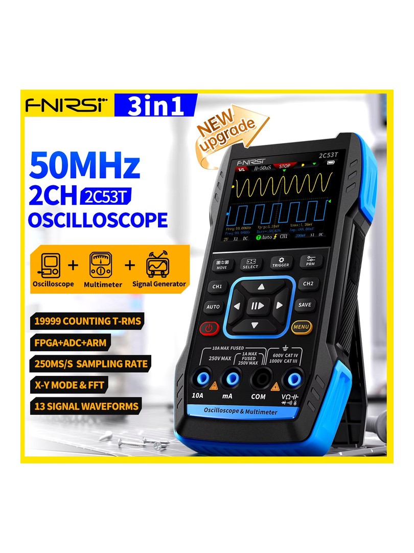 FNIRSI-2C53T to wszechstronny i bardzo praktyczny dwukanałowy oscyloskop cyfrowy typu „trzy w jednym” wprowadzony na rynek przez firmę FNIRSI, przeznaczony dla profesjonalistów z branży konserwacyjnej i badawczej. Urządzenie to łączy w sobie funkcje oscyloskopu, multimetru i generatora sygnału. Oscyloskop wykorzystuje architekturę sprzętową FPGA + ARM + ADC, oferując częstotliwość próbkowania 250MS/s, pasmo analogowe 50MHz i zintegrowany moduł ochrony przed wysokim napięciem, który obsługuje pomiary napięcia szczytowego do ±400V. Obsługuje również zapisywanie i przeglądanie zrzutów ekranu kształtu fali w celu dodatkowej analizy.