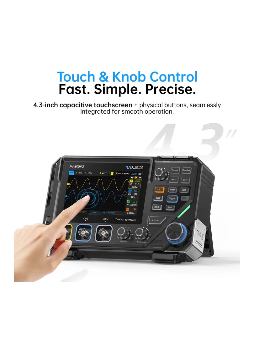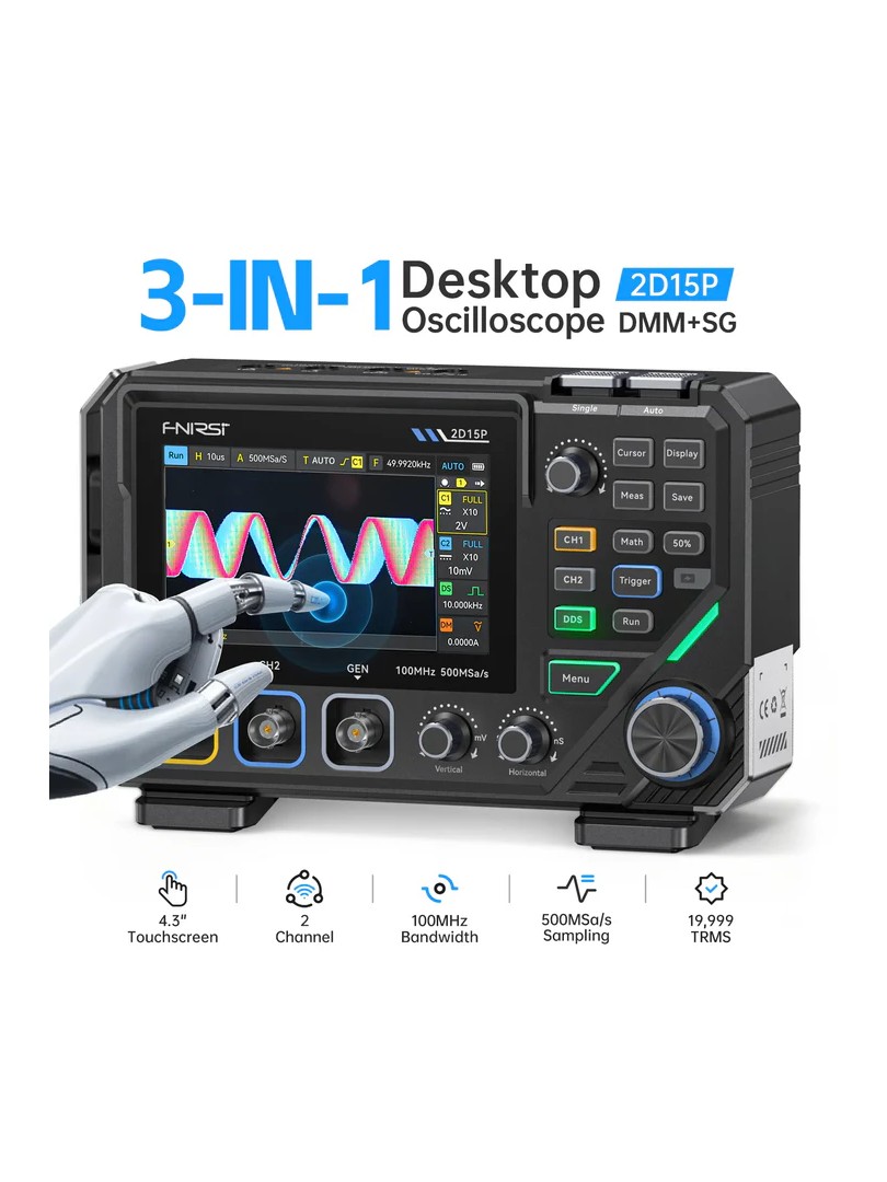 FNIRSI 2D15P to rewolucyjny przyrząd stacjonarny 3 w 1, który łączy w sobie cyfrowy oscyloskop fosforowy 100 MHz, precyzyjny multimetr True RMS o 19999 zliczeniach i wszechstronny generator sygnału w jednym kompaktowym urządzeniu. Zaprojektowany dla inżynierów, nauczycieli i hobbystów, oferuje profesjonalne funkcje z intuicyjnym interfejsem dotykowym i przenośnym zasilaniem.
