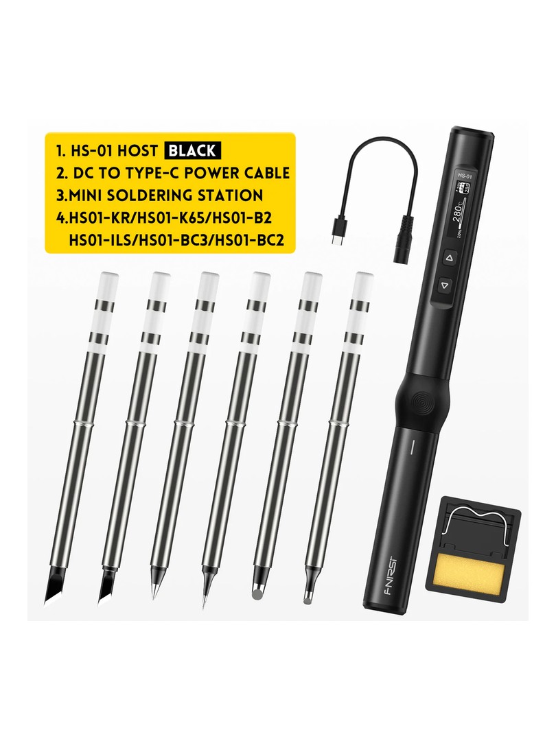 W zestawie z lutownicą Fnirsi HS01 dostarczany jest zestaw grotów lutowniczy, przewód USB typu C zakończony gniazdem DC, podstawka z gąbką oraz stojakiem na lutownicę oraz instrukcja obsługi w języku angielskim.