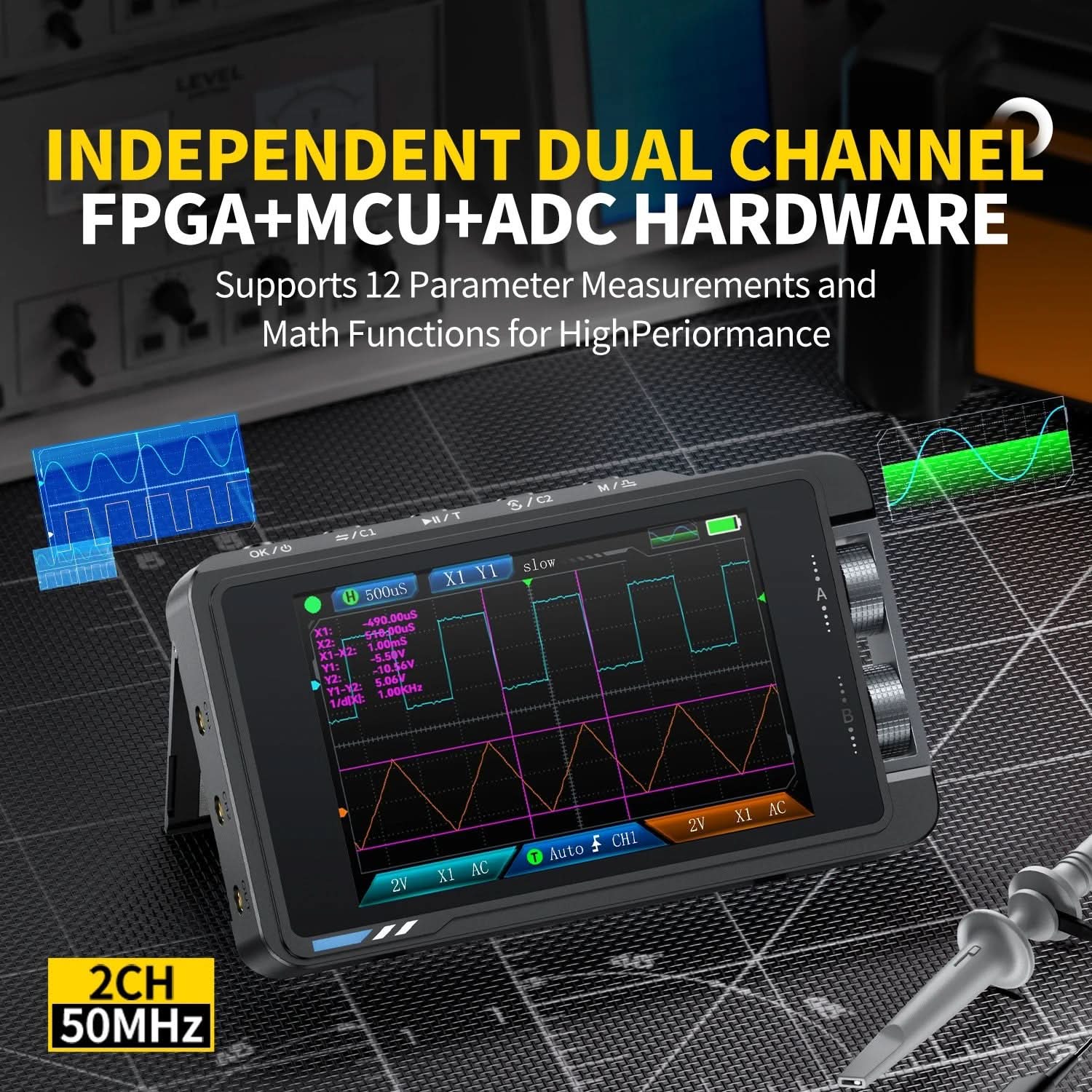 • Funkcjonalność 2 w 1: Połączenie oscyloskopu cyfrowego 50MHz i generatora sygnału DDS w jednym urządzeniu.