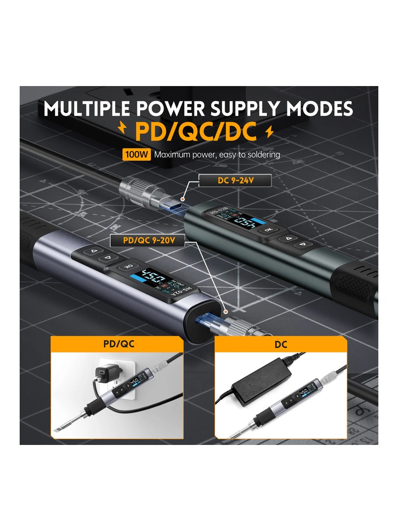• Wysoka moc i szybkie ładowanie: Inteligentna lutownica HS-02 zapewnia solidny zasilacz o mocy 100 W i obsługuje protokół PD/QC w celu szybkiego i wydajnego ładowania.