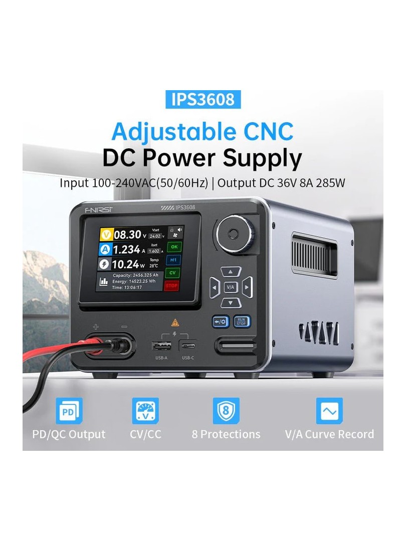 FNIRSI IP S3608 to precyzyjny, sterowany cyfrowo zasilacz AC-DC przeznaczony do zastosowań laboratoryjnych, testowych i elektroniki DIY. Charakteryzuje się szerokim zakresem regulacji napięcia i prądu, inteligentnymi zabezpieczeniami i przyjazną dla użytkownika obsługą za pomocą 2,8-calowego kolorowego wyświetlacza z intuicyjnymi elementami sterującymi. Dzięki niewielkim rozmiarom, inteligentnemu sterowaniu wyjściem i dokładnej regulacji jest idealny zarówno dla profesjonalistów, jak i hobbystów.