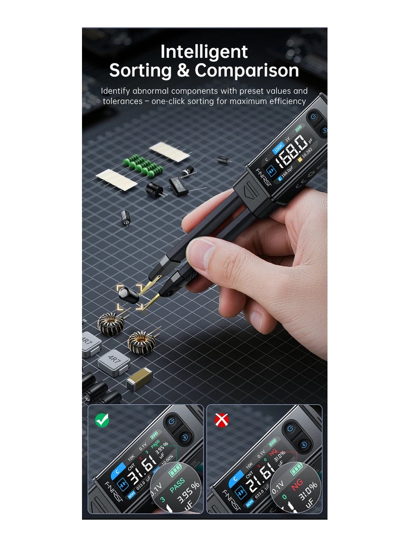 FNIRSI LCR-ST2 Standard zapewnia profesjonalny poziom testów LCR/ESR w kompaktowym formacie pęsety - idealny do szybkiej, precyzyjnej diagnostyki SMD, prac naprawczych i laboratoryjnej oceny komponentów.