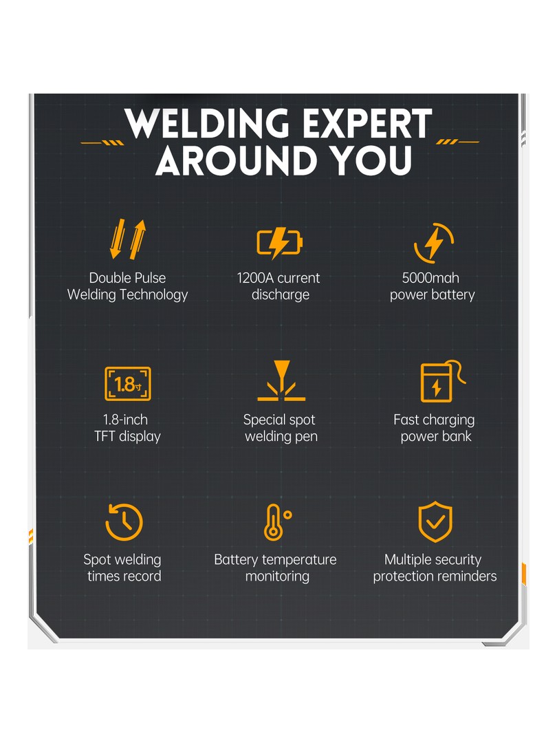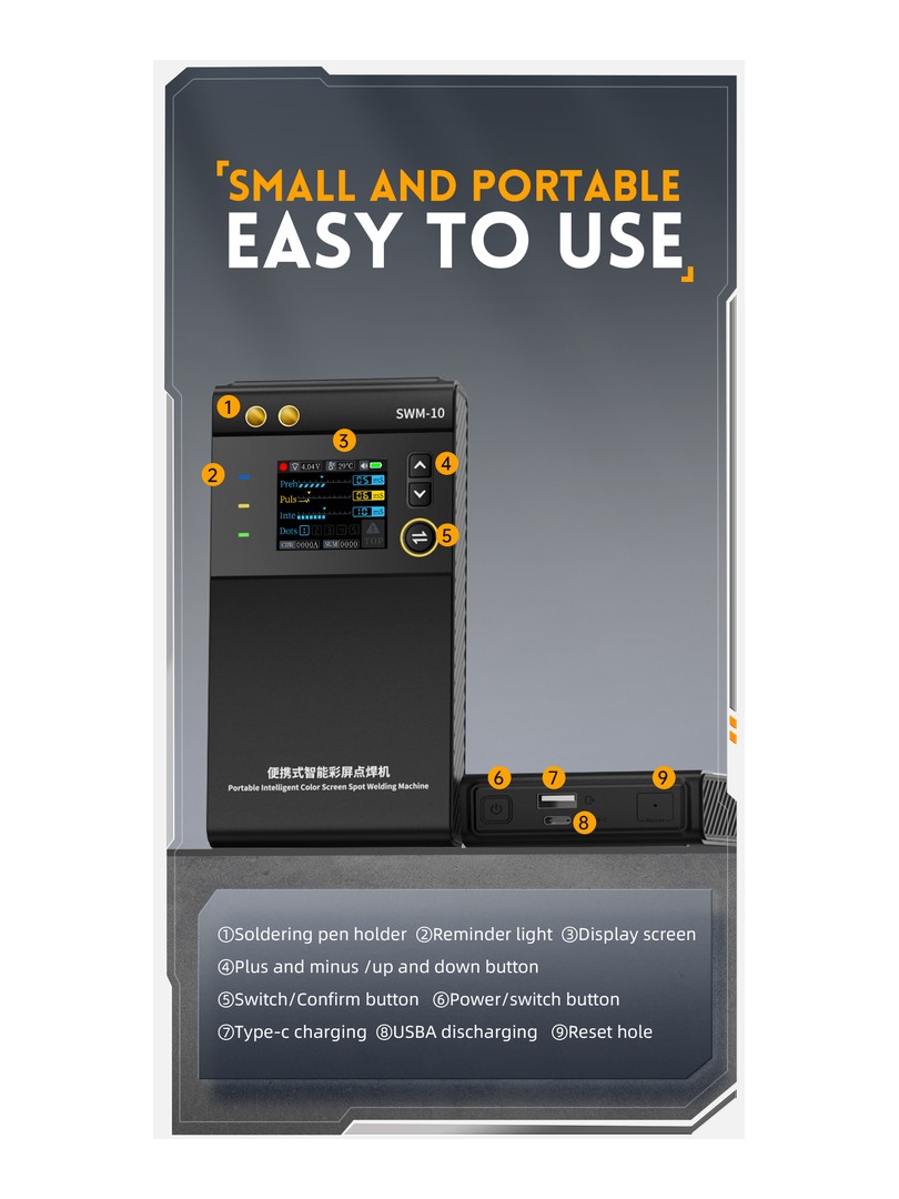 Przenośna ręczna zgrzewarka punktowaSWM-10 jest wydajnym, wygodnym i łatwym do przenoszenia narzędziem. Zastosowana technologia zgrzewania punktowego z podwójnym impulsem sprawia, że spawanie jest bardziej stabilne i trwałe, a także posiada funkcję power banku.