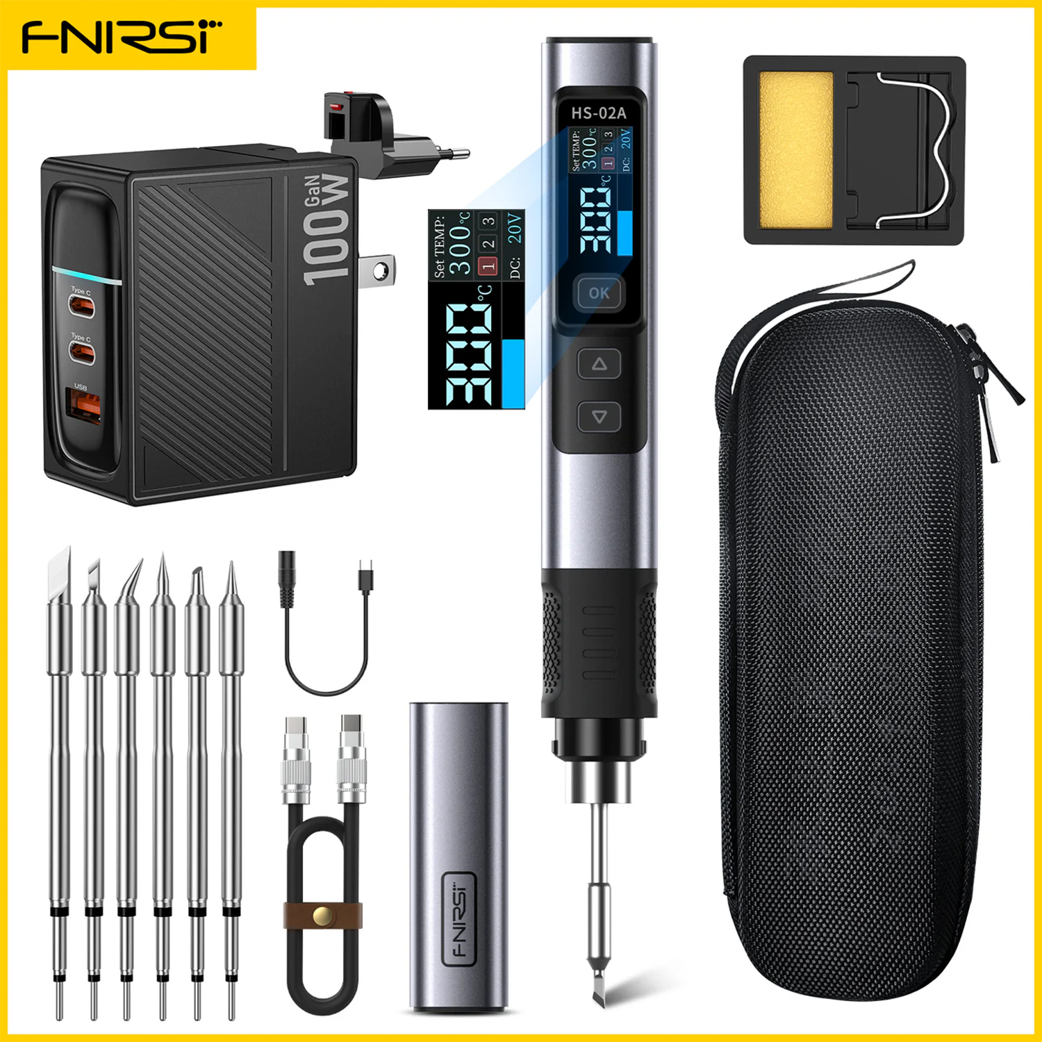 FNIRSI zestaw lutownica HS-02A podstawka kabel DC 6 grotów K,KU,JS,B,I,C2 ładowarka 100W przewód USB typu C
