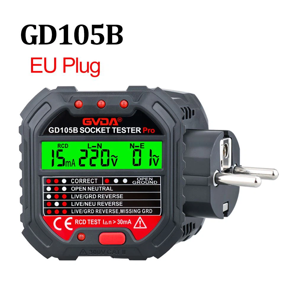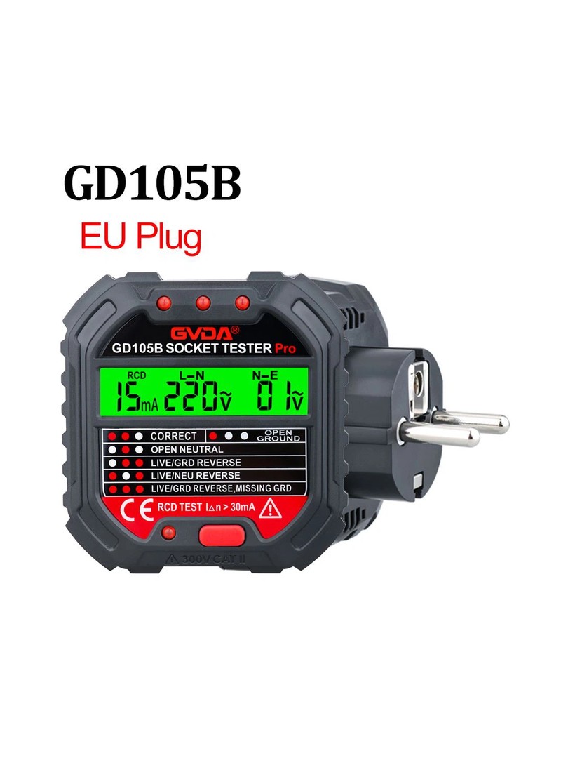 GVDA GD105B 90-250V Tester gniazdek 3-pinowych Tester wtyczek EU to wszechstronne i kompaktowe narzędzie przeznaczone do testowania gniazdek elektrycznych i okablowania gniazd. Nadaje się do użytku z wtyczkami typu EU, US i UK i zapewnia dokładne pomiary napięcia i funkcjonalności RCD/GFCI. Ten tester jest niezbędny zarówno dla profesjonalistów, jak i majsterkowiczów, aby zapewnić bezpieczeństwo instalacji elektrycznych.