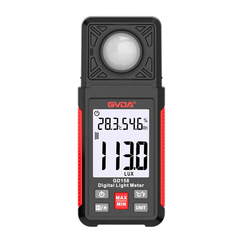 Cyfrowy luksomierz GVDA GD158 to wysoce precyzyjny cyfrowy luksomierz przeznaczony do pomiaru natężenia oświetlenia w różnych środowiskach. Wyposażony w zaawansowane funkcje, takie jak obrotowy czujnik, wiele jednostek pomiarowych i podświetlany wyświetlacz, ten światłomierz jest idealny do użytku profesjonalnego i osobistego w testach środowiskowych, fotografii i nie tylko.