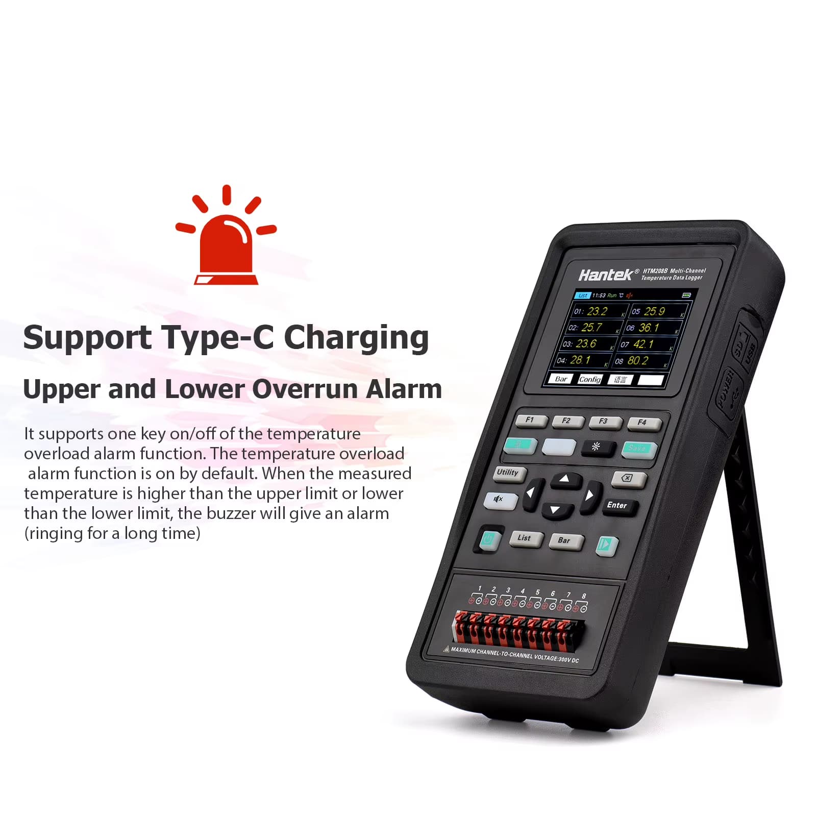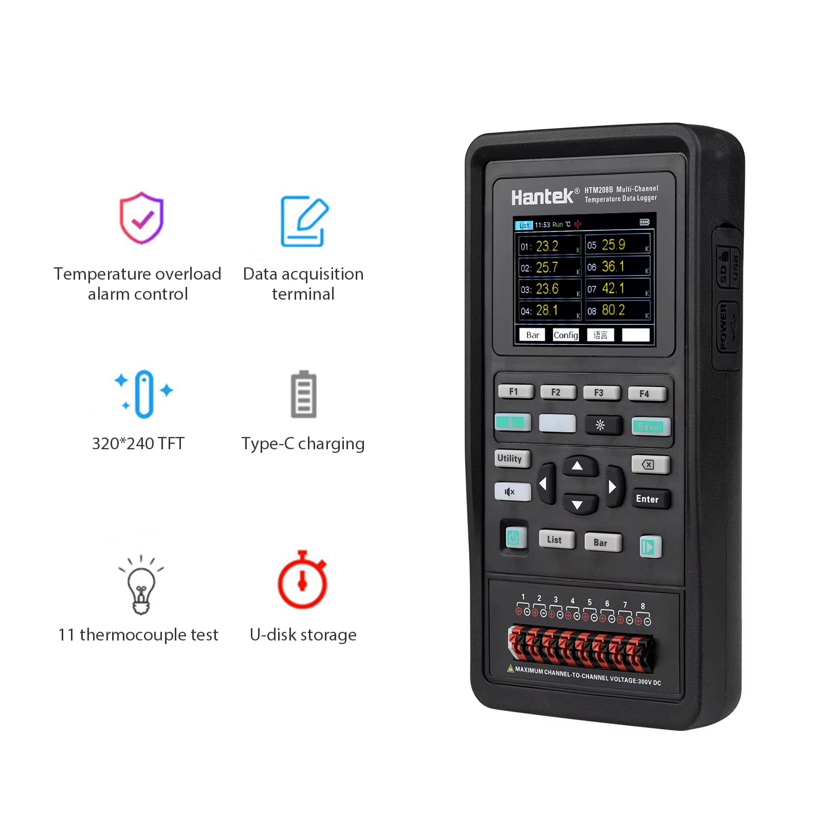 Ręczny wielokanałowy czujnik temperatury z serii HTM200 jest sterowany przez wysokowydajny 32-bitowy mikroprocesor ARM, umożliwiający wielokanałowe gromadzenie danych temperatury w czasie rzeczywistym. Dzięki obsłudze wyświetlania list i wykresów słupkowych, alarmów górnego/dolnego limitu i kompatybilności z 11 typami termopar, zapewnia stabilne i dokładne pomiary. Urządzenie posiada pamięć dyskową U z opcjonalną obsługą kart SD do wygodnego zarządzania danymi oraz opcjonalną funkcjonalność Bluetooth/4G do zdalnego gromadzenia danych.