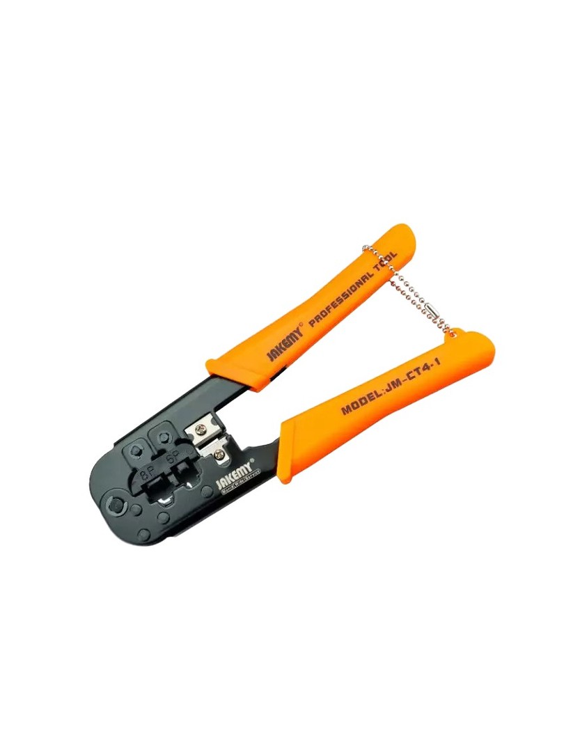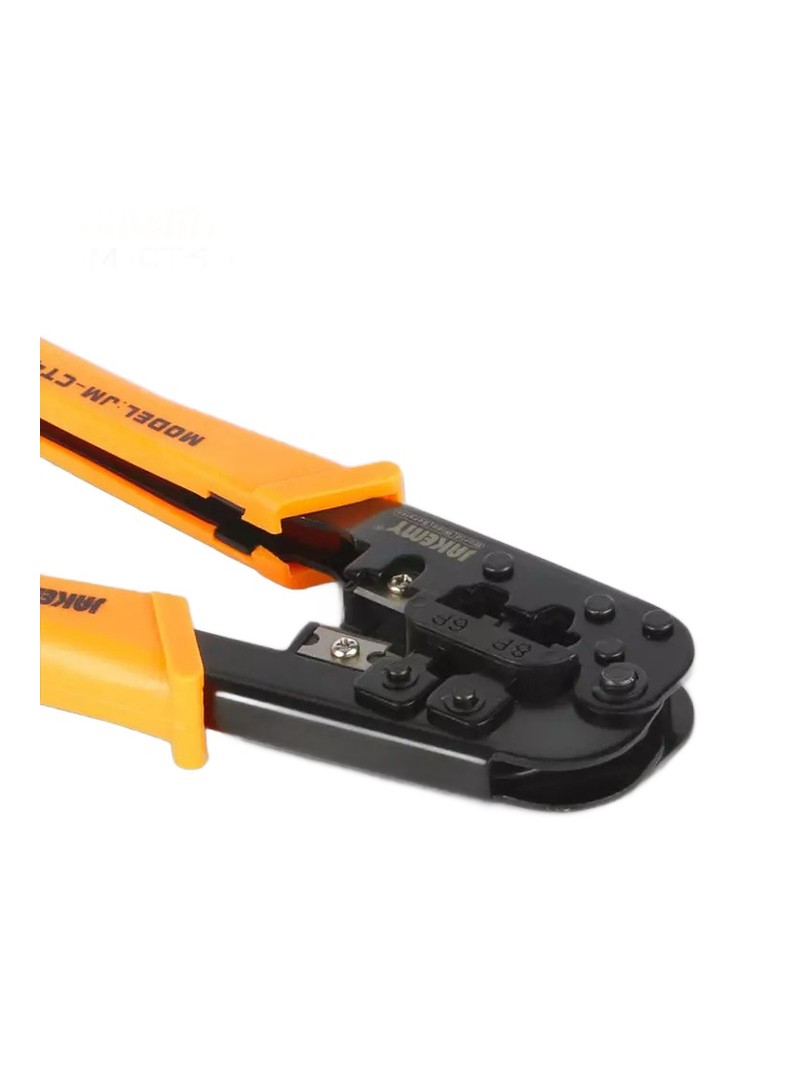 JAKEMY JM-CT4-1 to sieciowe narzędzie do zaciskania przeznaczone do zakańczania, cięcia i zdejmowania izolacji z kabli w zadaniach związanych z okablowaniem sieciowym i telefonicznym.
