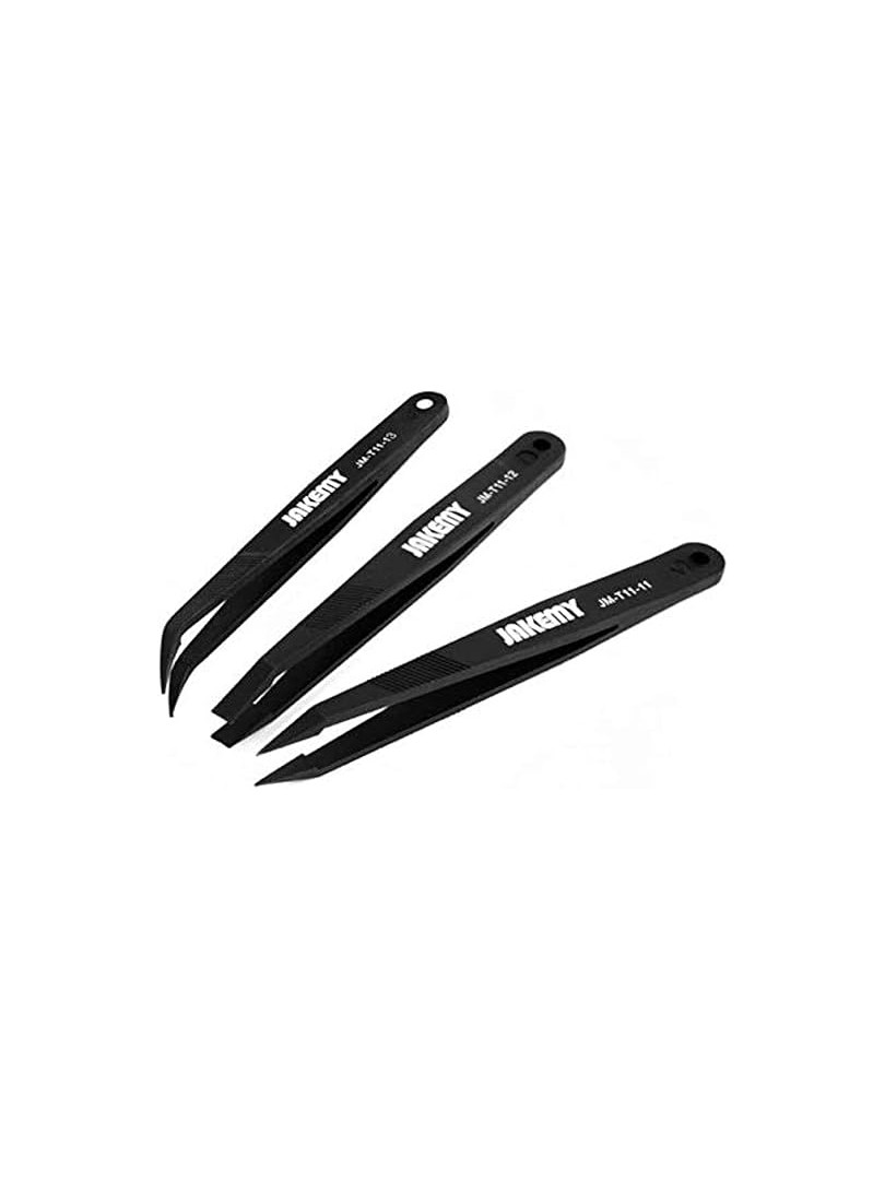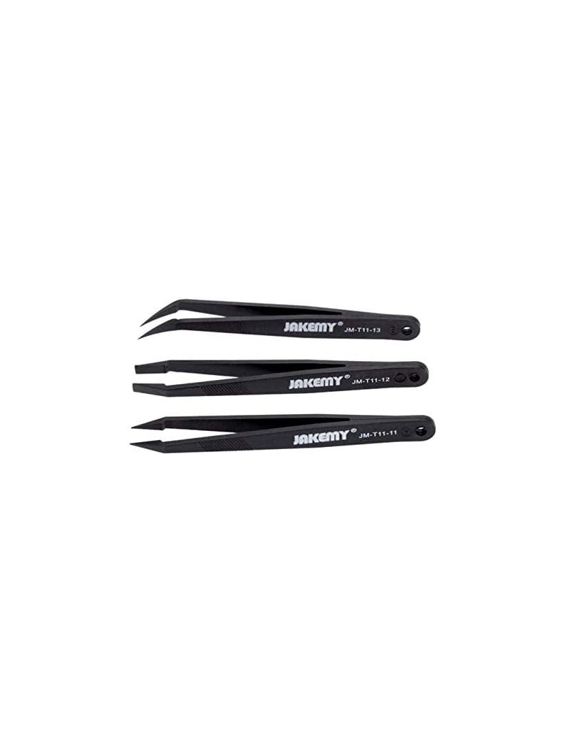 Zestaw pęset antystatycznych JAKEMY JM-T11 to precyzyjny zestaw narzędzi przeznaczony do obsługi małych komponentów podczas montażu elektroniki, napraw i prac laboratoryjnych.