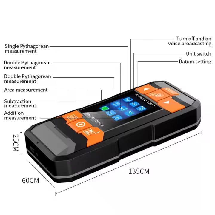 Dalmierz laserowy MK2101 i wykrywacz ukrytych elementów ściennych jest przeznaczony do wykrywania metali (prętów stalowych, rur miedzianych) i kabli ukrytych w ścianach, sufitach i podłogach. Może identyfikować obiekty takie jak metalowe ramy, przewody, drewniane konstrukcje pod płytami gipsowo-kartonowymi i inne. Dodatkowo służy jako dalmierz laserowy do pomiaru długości, powierzchni i objętości, w tym zaawansowanych funkcji, takich jak pomiary Pitagorasa, dodawanie i odejmowanie pomiarów.