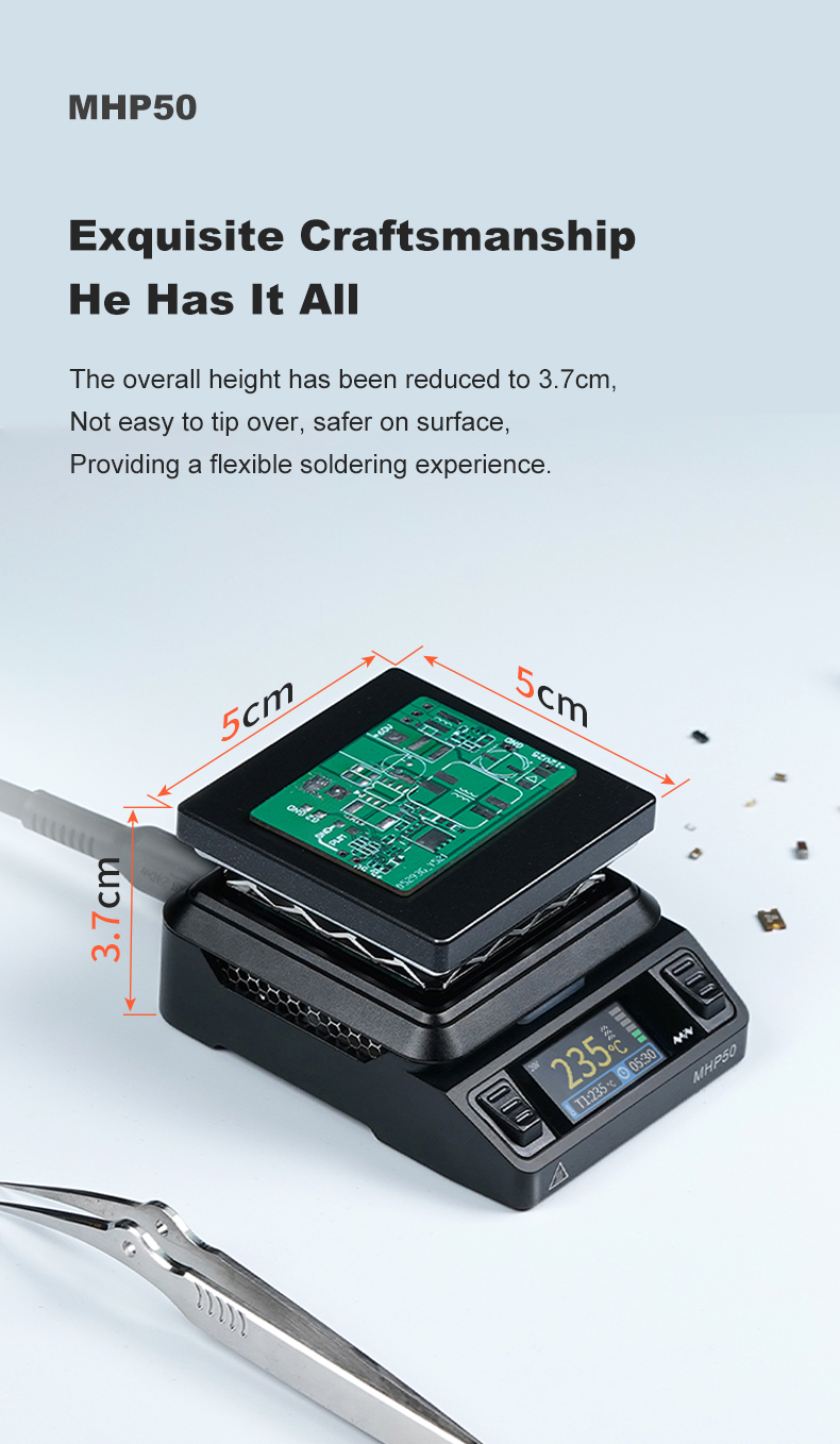 • Powierzchnia grzewcza 5 cm * 5 cm, wysokość 3,7 cm, mały kieszonkowy rozmiar, odpowiedni do mobilnych scenariuszy lutowania;