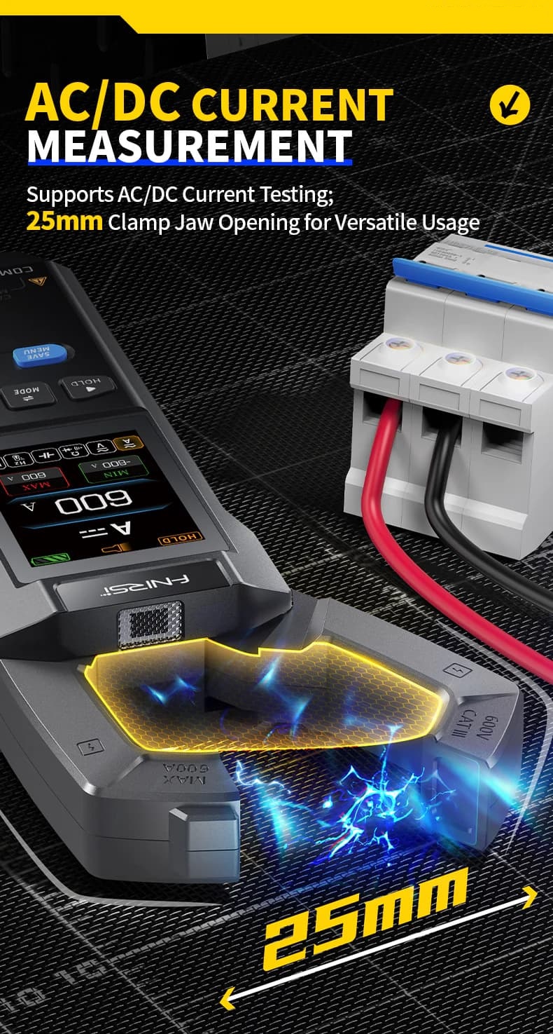 Inteligentny miernik cęgowy o wysokiej precyzji FNIRSI DMC-100 to nowoczesne narzędzie do dokładnych pomiarów o rozszerzonej funkcjonalności. Urządzenie umożliwia pomiar prądu stałego i zmiennego do 600A, napięcia stałego do 1000V, napięcia zmiennego do 750V, rezystancji do 100MΩ i pojemności do 100mF.