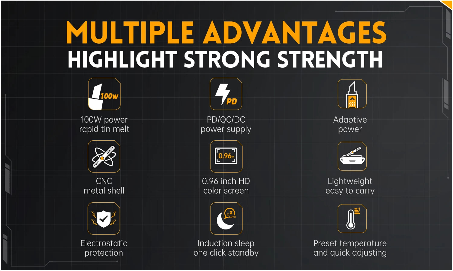 • Wysokowydajna lutownica 100W z precyzyjną kontrolą temperatury (100-450°C)