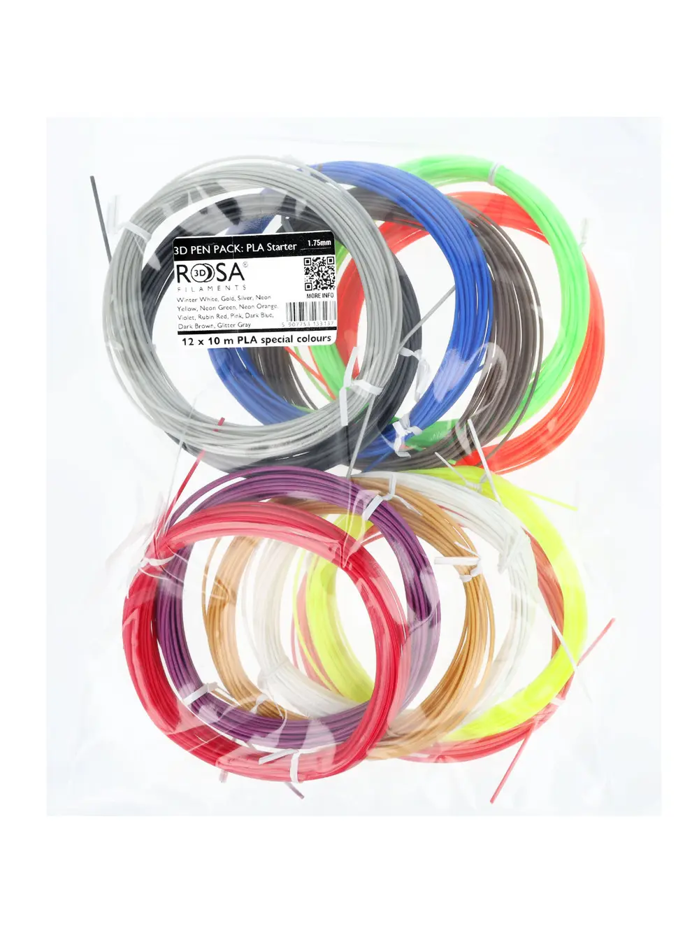 Zestaw zawiera 12 powtarzalnych specjalnych kolorów z oferty filamentów ROSA3D.Wybierając nasz zestaw masz gwarancję powtarzalności kolorów! NIE WYSYŁAMY LOSOWYCH KOLORÓW.W skład kompozycji ZAWSZE wchodzą następujące kolory :PLA Starter 1,75mm Winter White (zimny biały)PLA Starter 1,75mm Glitter Gray (szary z brokatem)PLA Starter 1,75mm Neon Green (Neonowy zielony)PLA Starter 1,75mm Rubin Red (Rubinowa czerwień)PLA Starter 1,75mm Neon Yellow (Neonowy Żółty)PLA Starter 1,75mm Neon Orange (Neonowy pomarańcz)PLA Starter 1,75mm Pink (jasny różowy)PLA Starter 1,75mm Violet (Filoletowy)PLA Starter 1,75mm Gold (złoty)PLA Starter 1,75mm Silver (srebrny)PLA Starter 1,75mm Dark Blue (ciemno niebieski)PLA Starter 1,75mm Dark Brown (ciemno brązowy)Niektóre kolory dostępne są na szpulach jako osobne pozycje w sklepie.Zestaw filamentów kompatybilny z większością dostępnych długopisów 3D na rynku:Zestaw 3D PEN PACK PLA 12 kolorów specjalnych x10 m jest doskonały do tworzenia za pomocą długopisu 3D kolorowych obiektów przestrzennych.Idealnie dobrane kolory pozwalają tworzyć kreatywne obiekty przestrzenne, rozwijając przy tym wyobraźnie przestrzenna i fantazję najmłodszych i nie tylko. Doskonale sprawdzi się jako kreatywne hobby dzieci, nastolatków jak również dorosłych.Intensywne i żywe kolory filamentów będą zachęcały do tworzenia ciekawych dzieł rozwijając talenty Twoich pociech! 12 kolorów pozwala stworzyć wielobarwne konstrukcje i rysunki.PLA Starter (polilaktyd) to wytrzymały i łatwy w użyciu filament, idealny dla osób rozpoczynających swoją przygodę z drukiem 3D.Opakowanie: filamenty zapakowane są w dużą wygodną torbę strunową, 12 zabezpieczonych krążków.Wybierając nasz zestaw masz gwarancję powtarzalności kolorów, istnieje możliwość dokupienia większego opakowania wyżej wskazanych kolorów w opakowaniach 100g i 1000g.