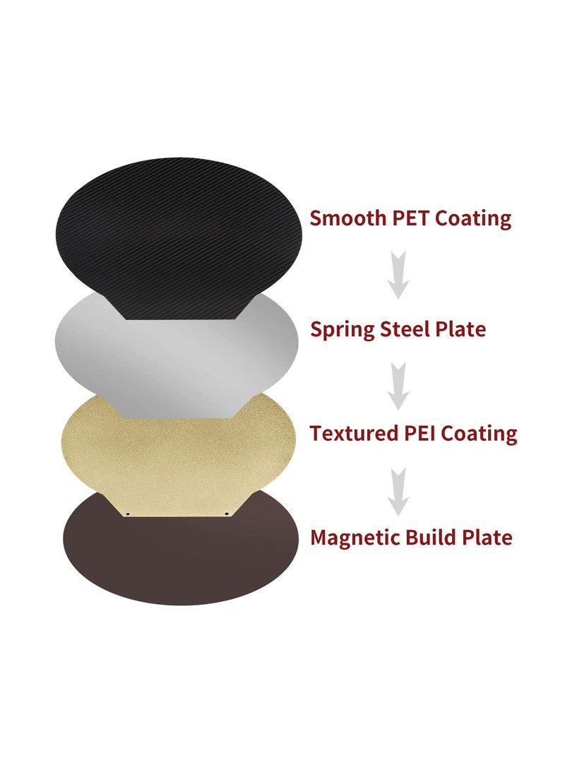 Podkładka PET nadaje się do druku wyłącznie z materiałami PLA, natomiast powierzchnia PEI pozwala na druk większości materiałów, takich jak PLA, ABS, PETG, TPU, nylon. Wytrzymuje również wysokie temperatury - powłoka PET do 120°C, a powłoka PEI do 260°C.