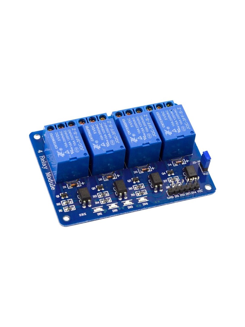 4 kanały SPDT | Zasilanie 5V | Obciążenie 250V AC 10A / 30V DC 10A | Izolacja optyczna | Wyzwalanie niskim stanem | 75 × 55 × 18 mm