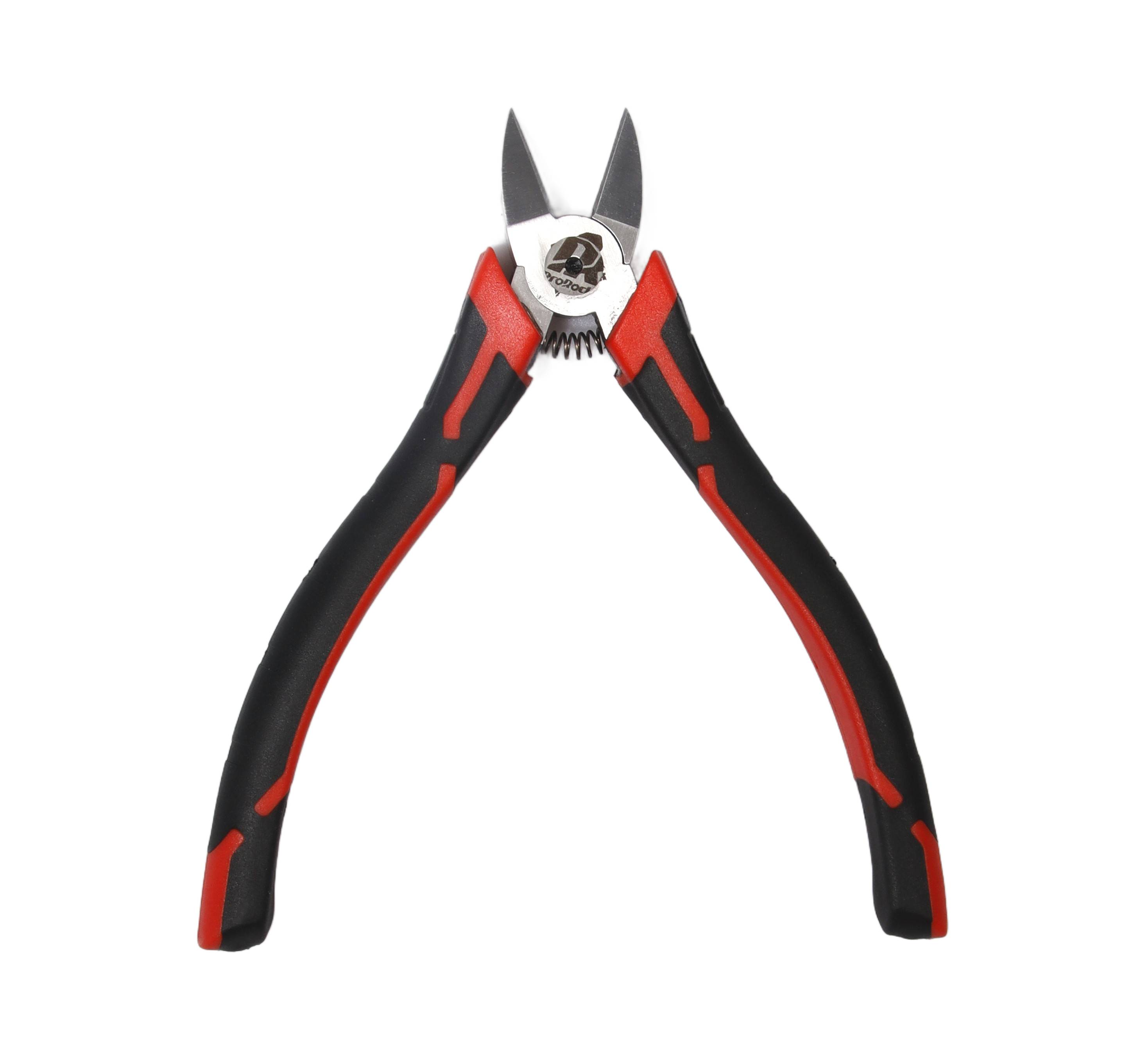 Profesjonalne szczypce do cięcia ukośnego wykonane z wysokiej jakości stali chromowo-wanadowej, charakteryzujące się eleganckim czarno-czerwonym wzornictwem.