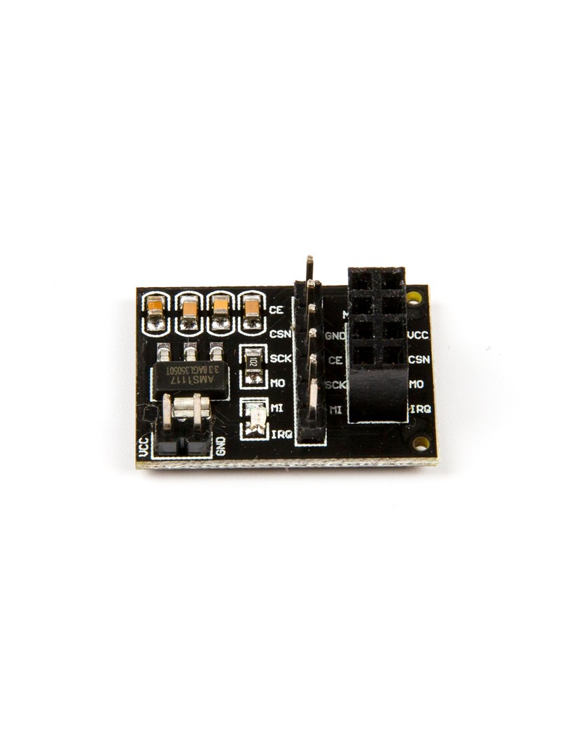 Adapter wyposażono w zintegrowany stabilizator napięcia AMS1117-3.3, który zapewnia działający zasilanie modułu radiowego z typowych systemów mikrokontrolarowych zasilanych napięciem 5V. Gniazdo ośmiopinowe umożliwia bezpośrednie podłączenie modułu NRF24L01 bez potrzeby lutowania, co ułatwia szybkie prototypowanie i montaż w projektach DIY, robotyce oraz systemach IoT.