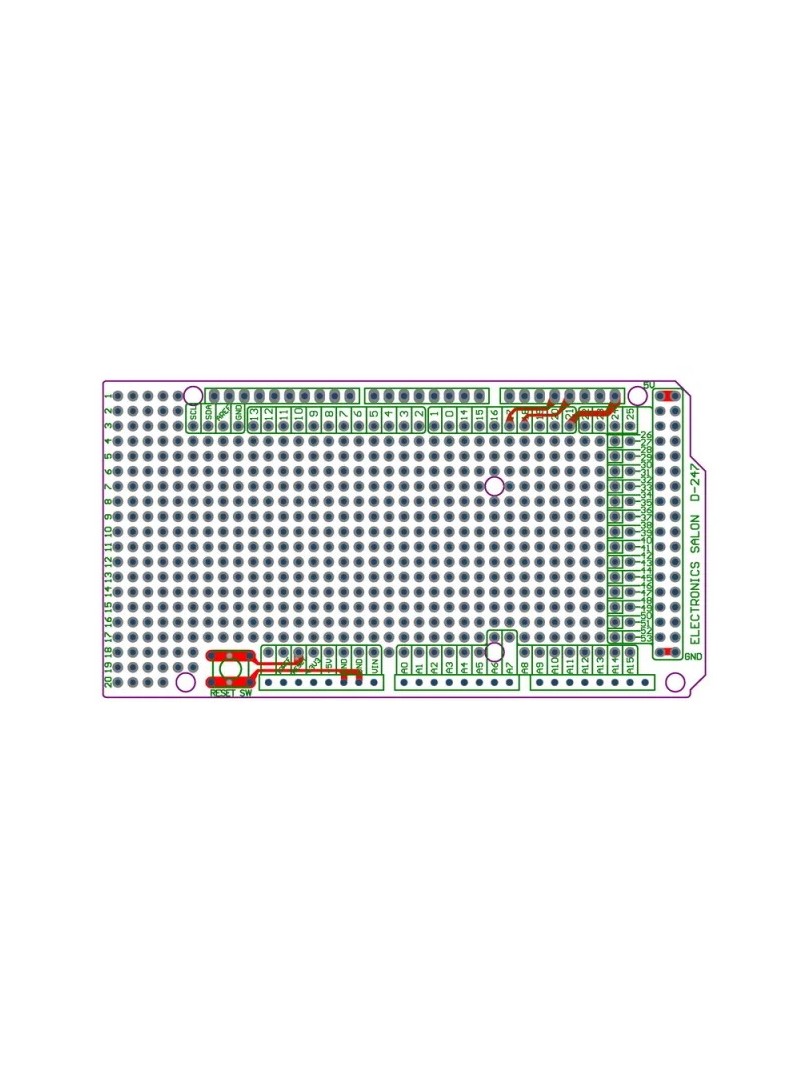 Wykonana z wysokiej jakości laminatu FR-4 z metalizowanymi otworami przelotowymi i podwójną warstwą miedzi, płytka zapewnia z tworzywa połączenia lutownicze i stałe mechaniczną gotowego układu. Wyposażona w siatkę otworów prototypowych oraz dedykowane miejsca pod zaciski śrubowe, stanowi techniczny podstawę do tworzenia spersonalizowanych shield'ów montażowych.