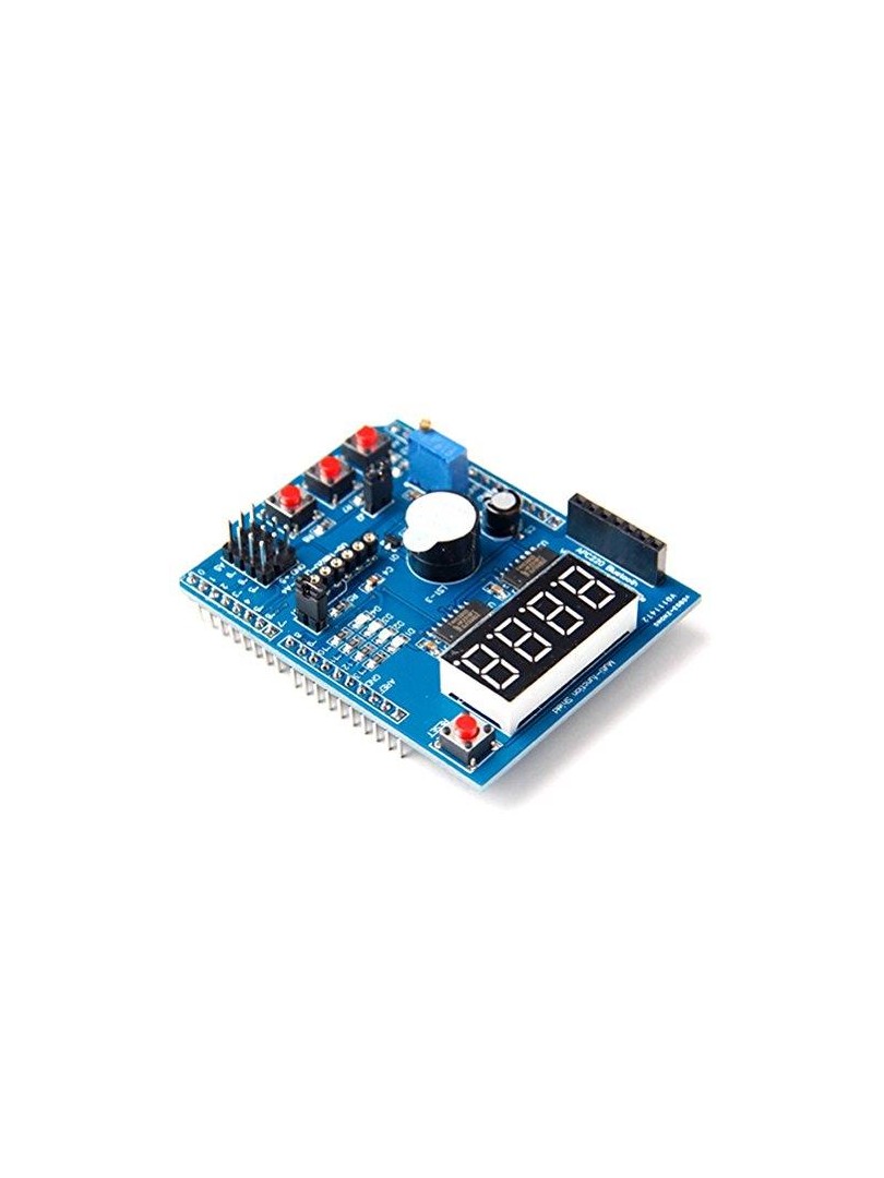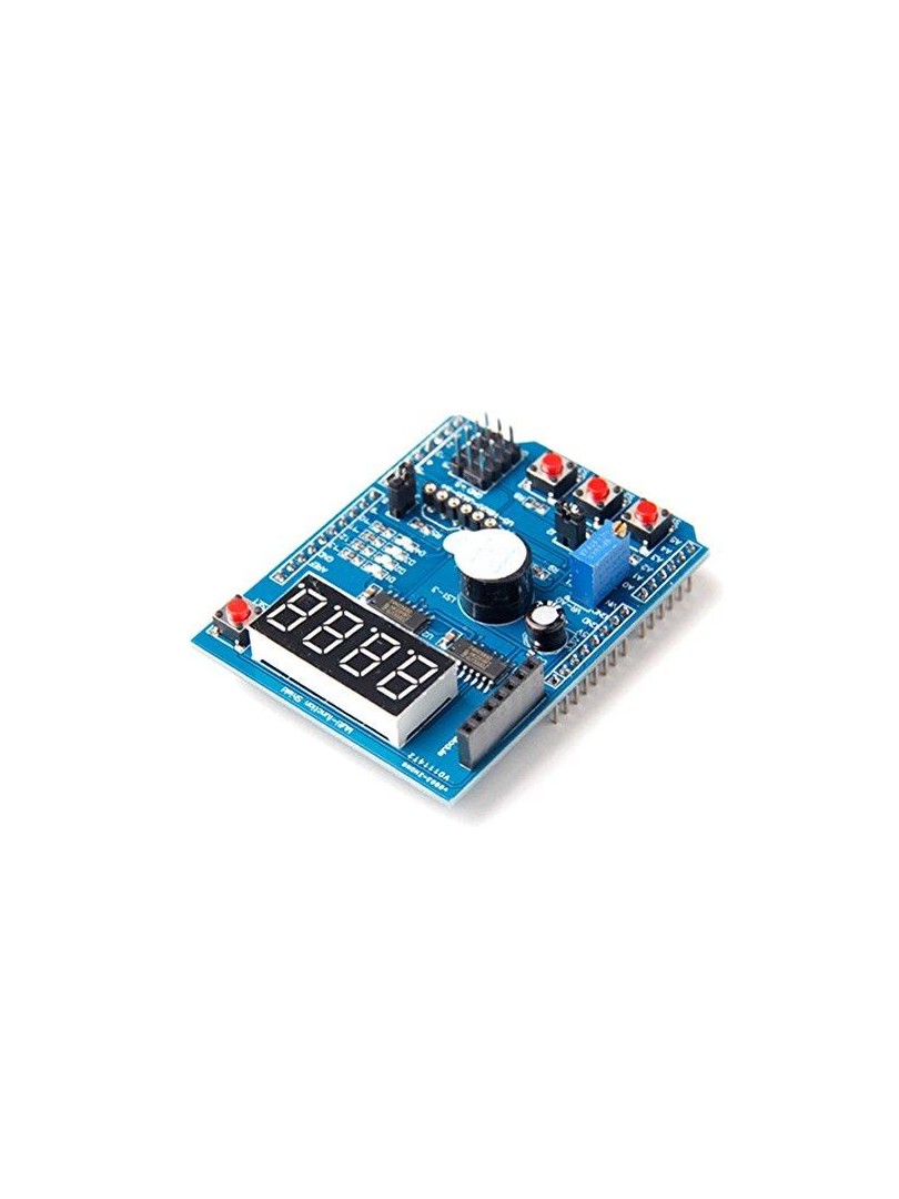 Shield Arduino z wyświetlaczem 4-cyfrowym LED 7-segmentowym | sterownik 74HC595 | 4 LED | 3 przyciski funkcyjne + reset | buzzer | odbiornik IR | potencjometr dokładny 3296 | interfejsy DS18B20 i LM35 | złącze servo | kompatybilny z Arduino UNO, Leonardo, Mega 2560