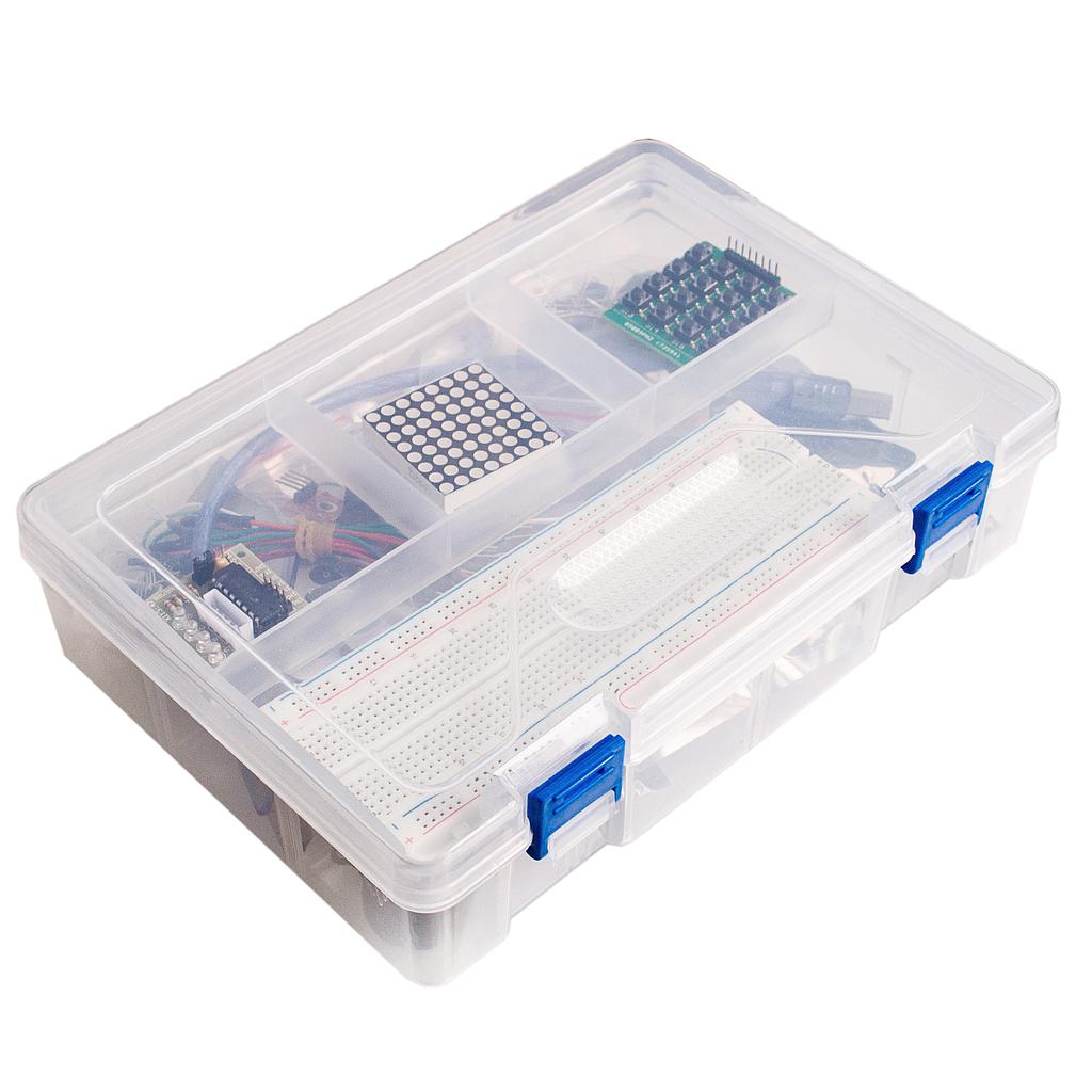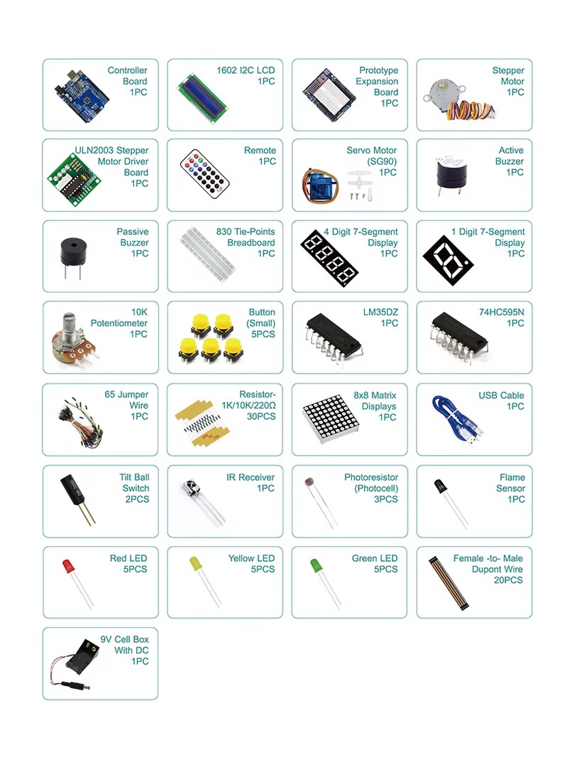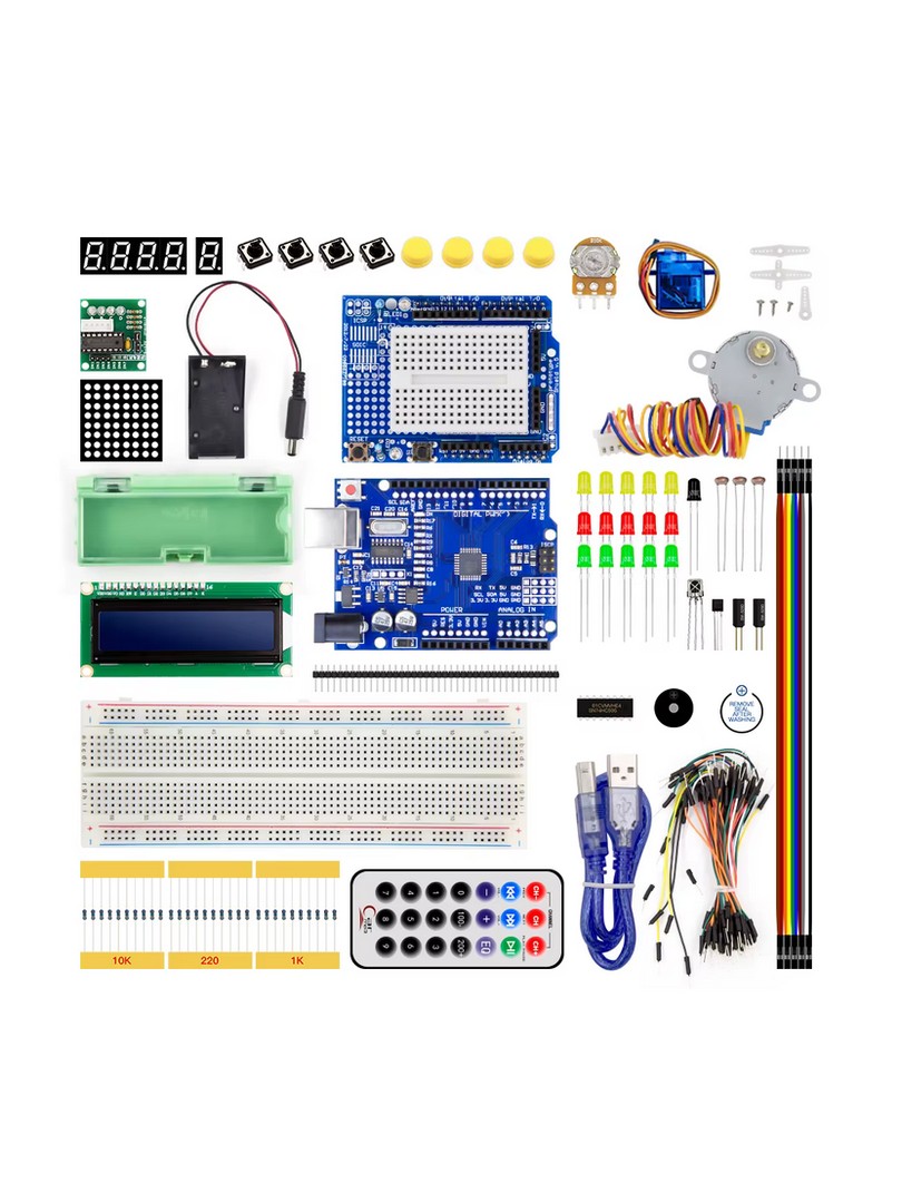 ProRock Arduino UNO R3 Compatible Beginners Starter Kit (AE103) to zestaw edukacyjny przeznaczony dla początkujących użytkowników, studentów oraz entuzjastów elektroniki. Zawiera czujników, wyświetlaczy, silników oraz elementów elektronicznych umożliwiających praktyczną naukę elektroniki, programowania oraz podstaw robotyki z wykorzystaniem środowiska Arduino IDE.