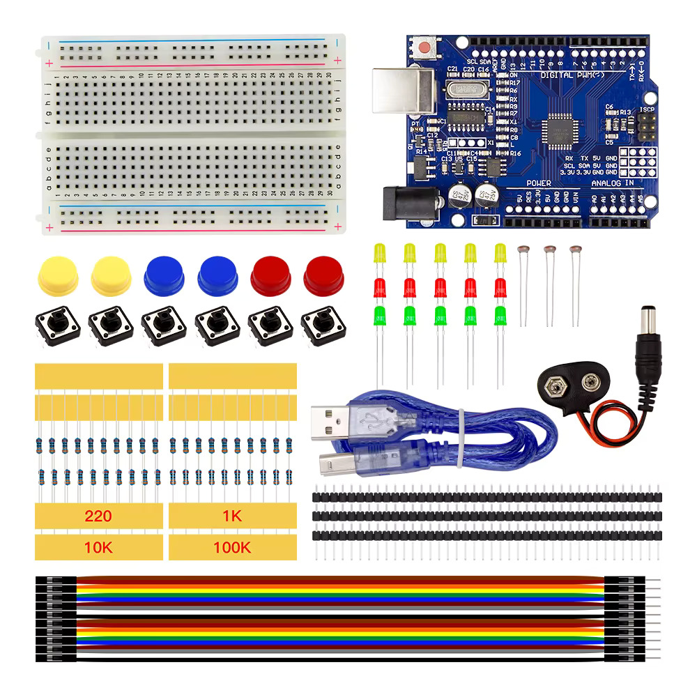 ProRock Arduino UNO R3 compatible Basic Starter Kit to zestaw edukacyjny przeznaczony do nauki podstaw elektroniki, programowania oraz robotyki w środowisku kompatybilnym z Arduino. Zawiera płytkę kontrolera kompatybilnego z UNO R3 oraz podstawowe komponenty umożliwiające budowę obwodów elektronicznych bez lutowania. Zestaw skierowany jest do początkujących, studentów oraz użytkowników zainteresowanych edukacją STEAM.