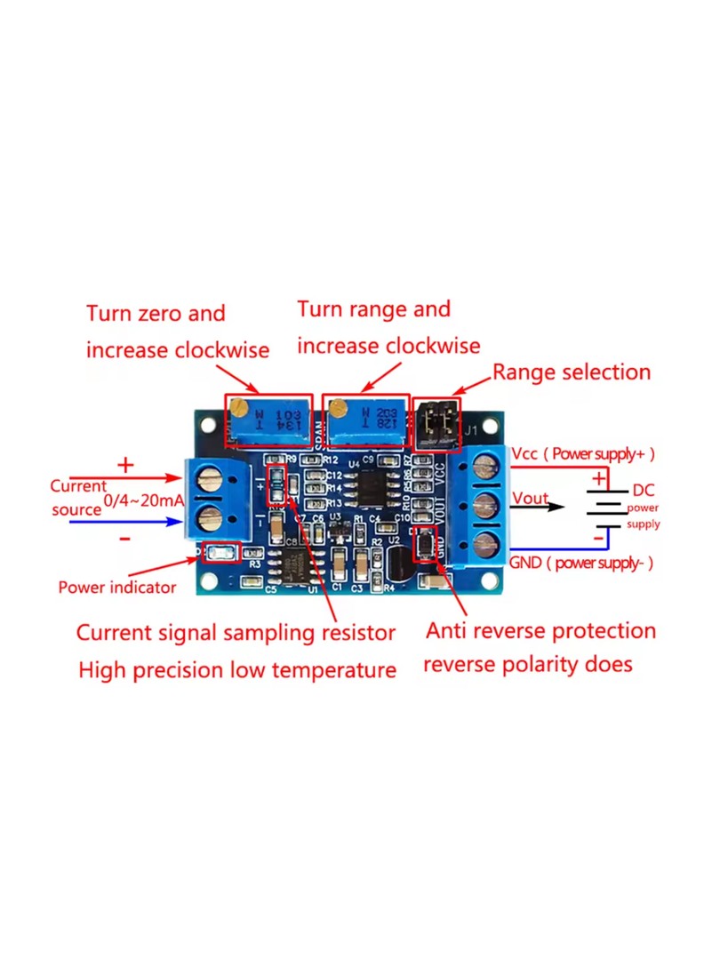Moduł odbiera sygnał prądowy z pętli w zakresie od zera do dwudziestu miliamperów lub od czterech do dwudziestu miliamperów. Wewnętrzny układ przetwarza prąd na odpowiadające mu napięcie wyjściowe w wybranym zakresie. Relacja między wejściem a wyjściem jest liniowa — minimalna wartość prądu odpowiada minimalnemu napięciu, maksymalna wartość prądu odpowiada maksymalnemu napięciu. Sygnał wyjściowy może być bezpośrednio odczytany przez przetwornik analogowo-cyfrowy mikrokontrolera lub wejście analogowe sterownika PLC.