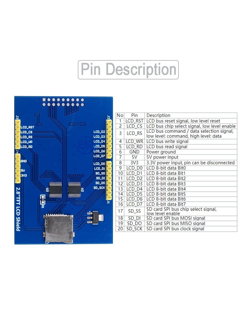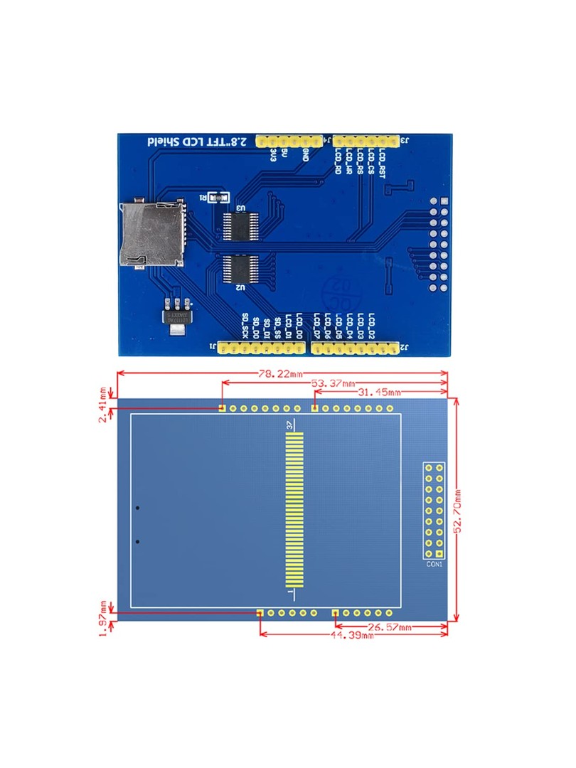 Moduł wyposażono w szybki ośmiobitowy interfejs równoległy, wbudowane przesuwniki poziomów logicznych oraz stabilizator napięcia umożliwiający pracę z pięciowoltową magistralą Arduino przy zachowaniu trójwoltowej logiki wyświetlacza. Gniazdo microSD umożliwia przechowywanie plików graficznych, czcionek oraz danych projektu.