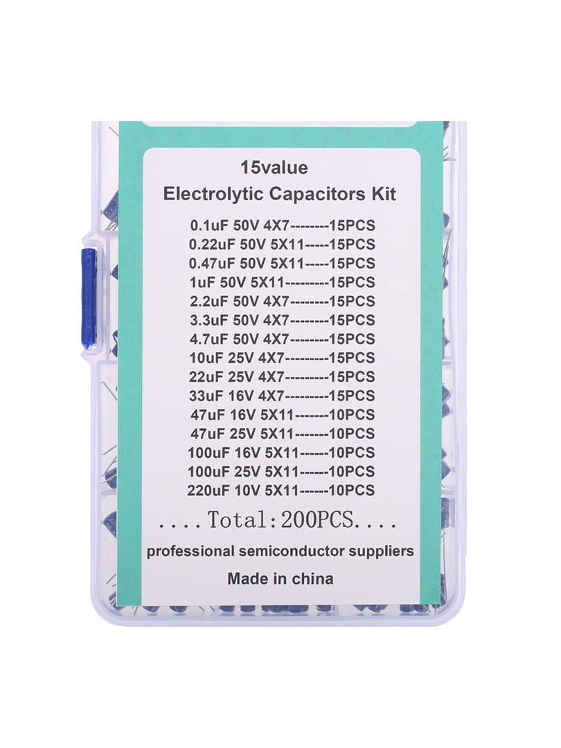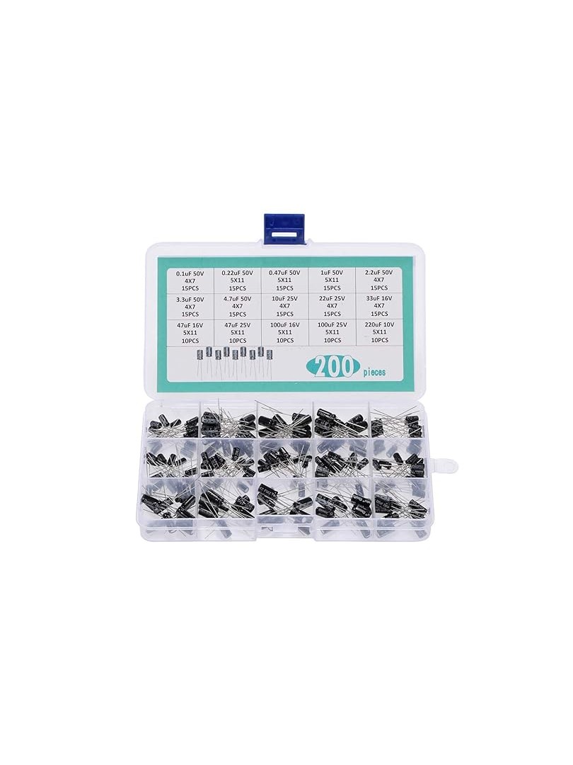 Wartości pojemności i napięć dobrano pod kątem częstych potrzeb prototypowania, napraw elektronicznych oraz budowy układów audio i zasilających. Wszystkie komponenty są wyraźnie oznaczone i przechowywane w plastikowym organizerze ułatwiającym identyfikację i dostęp.