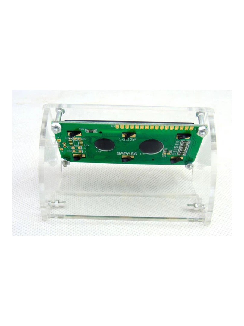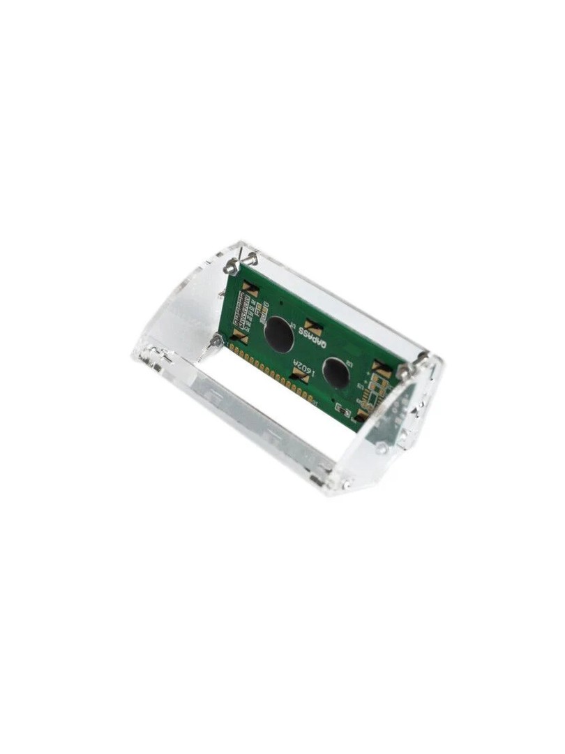 Obudowa działa jako mechaniczne wsparcie dla modułu LCD1602. Rama montażowa zapobiega zginaniu się płytki PCB i naciskowi na wyprowadzenia pinowe. Punkty montażowe utrzymują wyświetlacz w ustalonej pozycji, zapewniając stałe ustawienie kąta widzenia. Warstwa ochronna ogranicza kontakt mechaniczny z powierzchnią płytki i elementami elektronicznymi zamontowanymi na wyświetlaczu.