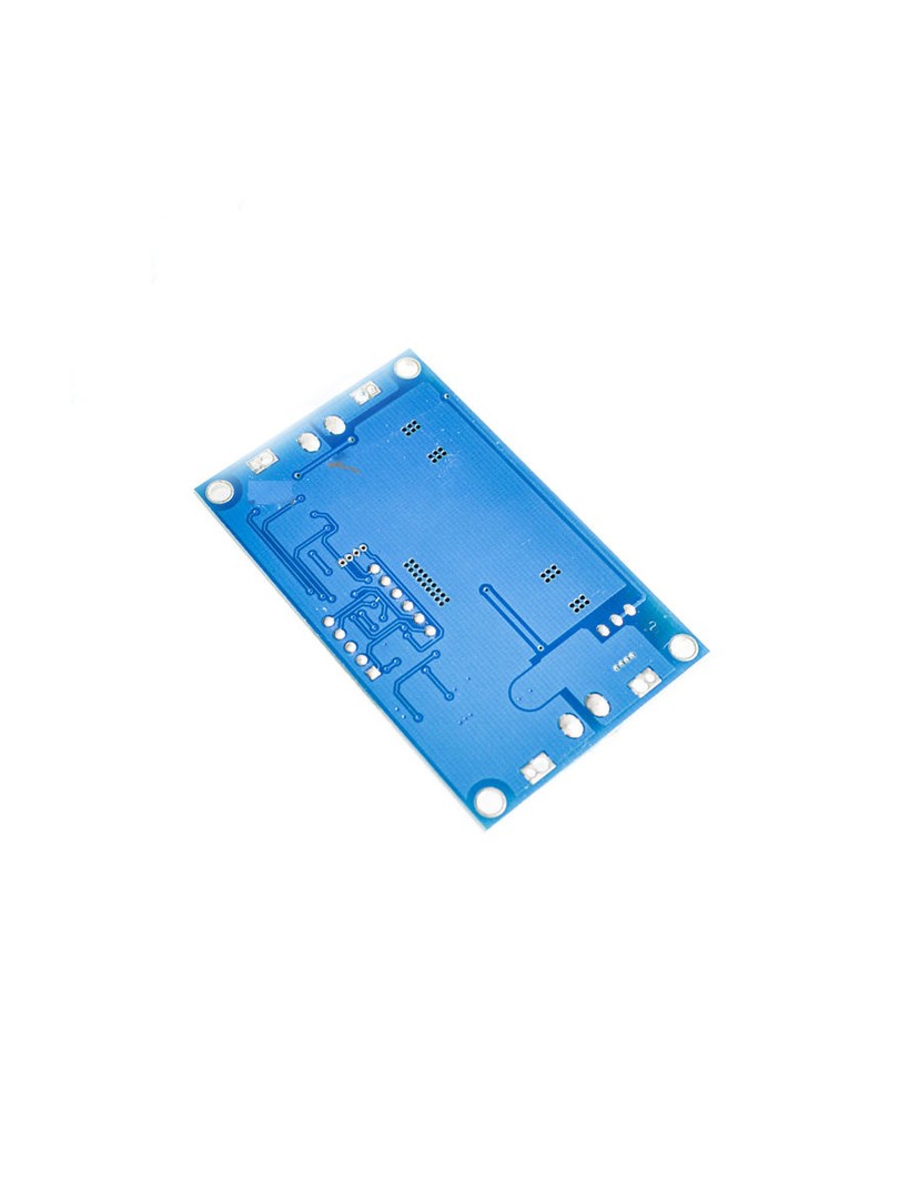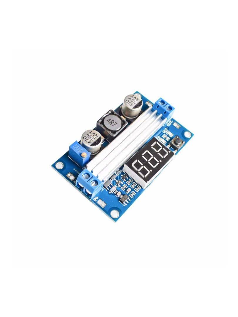 Moduł działa jako przetwornica impulsowa podwyższająca napięcie (boost converter), wykorzystująca energię zgromadzoną w cewce do zwiększenia napięcia wyjściowego powyżej wartości wejściowej. Układ wymaga, aby napięcie wyjściowe było zawsze równe lub wyższe od napięcia wejściowego — nie działa w trybie obniżającym (buck). Użytkownik reguluje napięcie wyjściowe za pomocą potencjometru, a cyfrowy woltomierz pozwala na monitoring zarówno napięcia wejściowego, jak i wyjściowego poprzez przełączanie przycisku. Wskaźniki LED IN oraz OUT informują o aktywnym trybie pomiaru. Dla osiągnięcia wysokiej mocy wyjściowej konieczne jest odpowiednie chłodzenie układu oraz praca przy napięciach powyżej dwudziestu woltów.