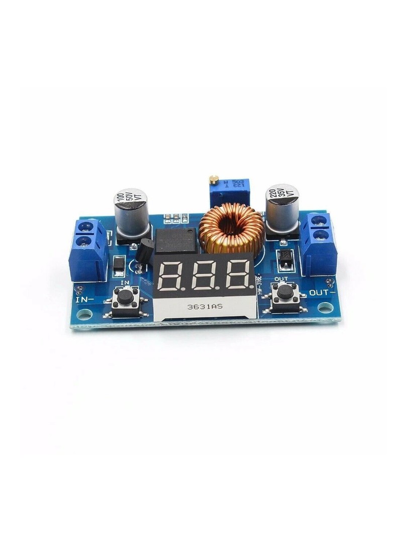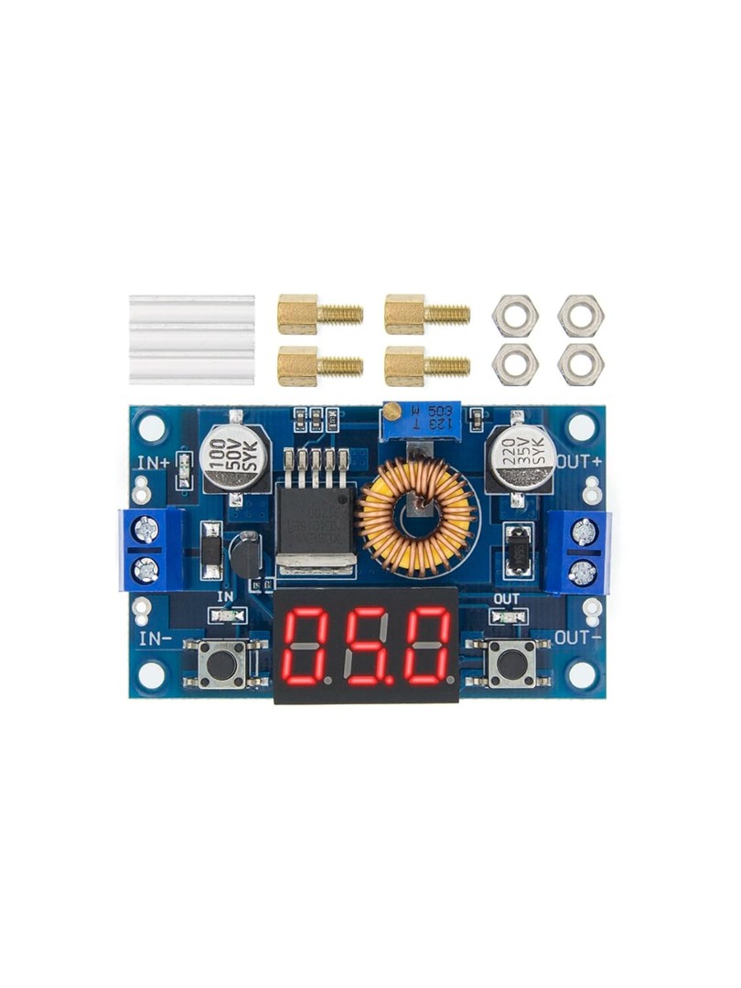 Moduł wykorzystuje układ scalony XL4015 do realizacji przetwornicy obniżającej napięcie. Kontroler pracuje z częstotliwością przełączania i steruje tranzystorem mocy w celu utrzymania zadanego napięcia wyjściowego niezależnie od zmian obciążenia i napięcia wejściowego. Wbudowany woltomierz cyfrowy pobiera próbki napięcia i wyświetla wartość na trzycyfrowym wyświetlaczu LED. Użytkownik może przełączać pomiar między wejściem a wyjściem oraz kalibrować wskazania przytrzymując prawy przycisk i regulując wartość.
