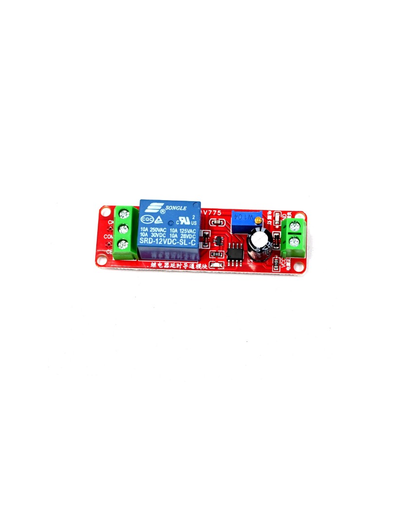 Po podłączeniu napięcia zasilającego moduł rozpoczyna odmierzanie czasu opóźnienia. Przez cały ten okres przekaźnik pozostaje w stanie wyjściowym, a dioda LED wskazuje fazę czasową. Po upływie ustawionego czasu opóźnienia przekaźnik zmienia stan: styk NO łączy się z COM, styk NC rozwiera się od COM. Moduł utrzymuje przekaźnik w stanie aktywnym dopóki zasilanie pozostaje podłączone. Czas opóźnienia ustalany jest przez wartość rezystancji potencjometru oraz pojemności kondensatora według wzoru T = 1,1 × R × C.