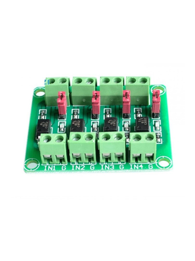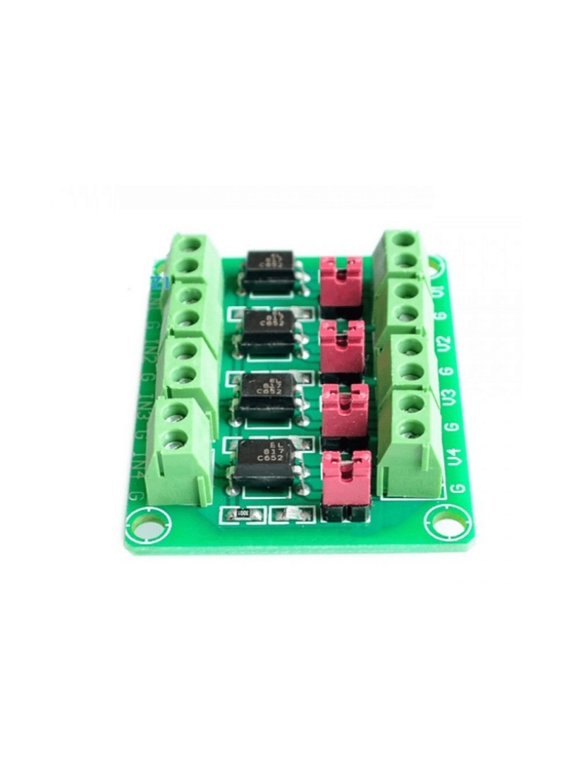 Optoizolator PC817 składa się z diody elektroluminescencyjnej LED oraz fototranzystora umieszczonych w jednej obudowie. Sygnał wejściowy steruje diodą LED po stronie sterującej, a emitowane światło powoduje przewodzenie fototranzystora po stronie wyjściowej. Dzięki optycznemu sprzężeniu brak jest fizycznego połączenia elektrycznego pomiędzy obwodami wejściowym i wyjściowym, co eliminuje pętle masy oraz izoluje różnice potencjałów. Każdy z czterech kanałów modułu działa według tej samej zasady, przy czym wszystkie kanały pozostają od siebie elektrycznie niezależne. Zworki montażowe umożliwiają podłączenie rezystorów w konfiguracji pull-up lub pull-down na wyjściu każdego kanału zgodnie z wymaganiami interfejsu docelowego.