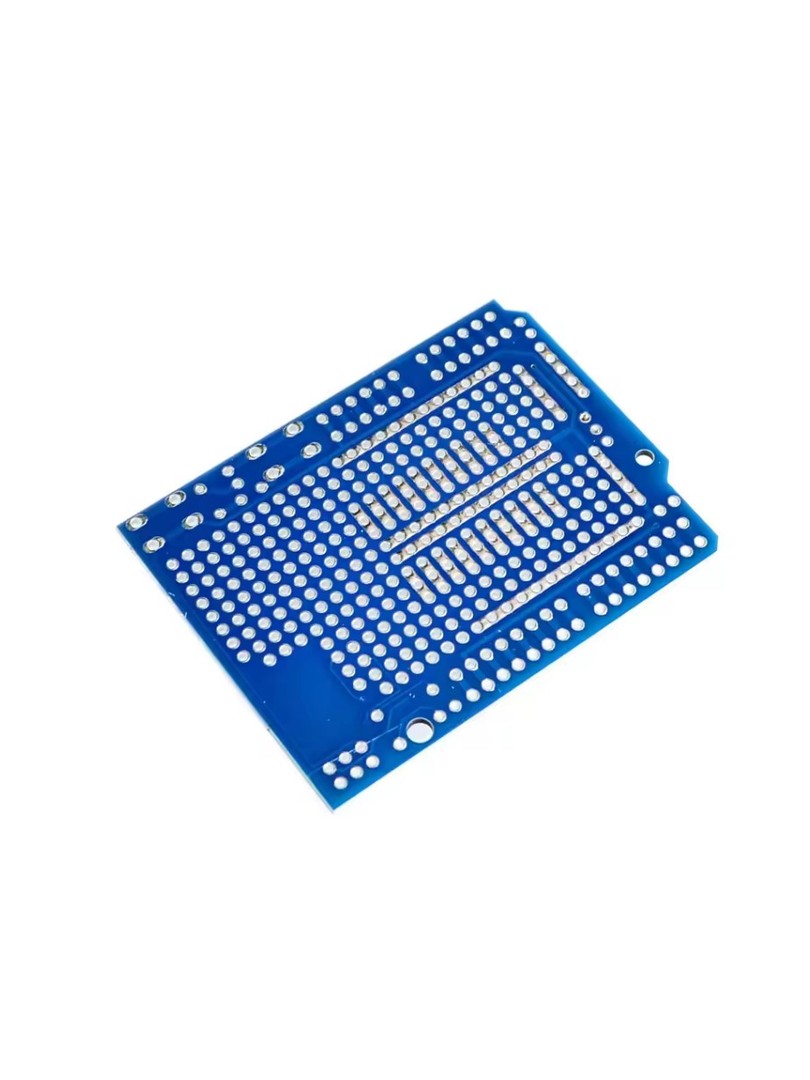 Płyta prototypowa ProRock dla Arduino UNO R3 to dwustronna płytka PCB w formacie shield, zaprojektowana do montażu bezpośrednio na płycie Arduino UNO R3. Wykonana z włókna szklanego FR-4 z metalizowanymi otworami przelotowymi, umożliwia budowę z tworzywa prototypów lutowanych, obwodów pomiarowych oraz dedykowanych rozszerzeń sprzętowych.