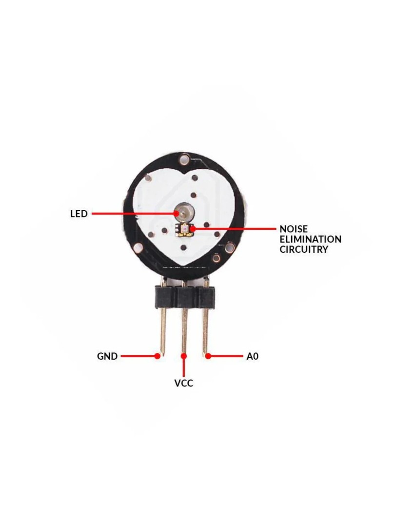 Dioda LED zamontowana na module emituje światło o długości fali przenikającej przez skórę i naczynia krwionośne. Podczas skurczu serca objętość krwi w naczyniach włosowatych wzrasta, co zmienia poziom absorpcji i odbicia światła. Fotodetektor rejestruje te zmiany i przekształca je na sygnał elektryczny. Układ wzmacniacza operacyjnego zwiększa amplitudę sygnału, a filtr analogowy usuwa składowe szumu. Na wyjściu SIG dostępny jest analogowy przebieg odpowiadający rytmowi pracy serca.