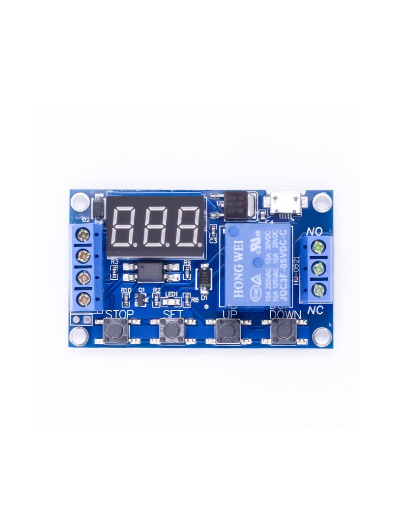 Moduł przekaźnika czasowego ProRock to programowalne urządzenie przeznaczone do sterowania opóźnionym wyłączaniem, cyklicznego czasowania oraz automatycznego przełączania obciążeń w systemach elektronicznych i przemysłowych. Wyposażony w cyfrowy wyświetlacz parametrów oraz przekaźnik zdolny do sterowania zarówno obciążeniami stałoprądowymi, jak i zmiennoprądowymi. Moduł wspiera szerokie napięcie zasilania oraz opcjonalne zasilanie przez port Micro USB.