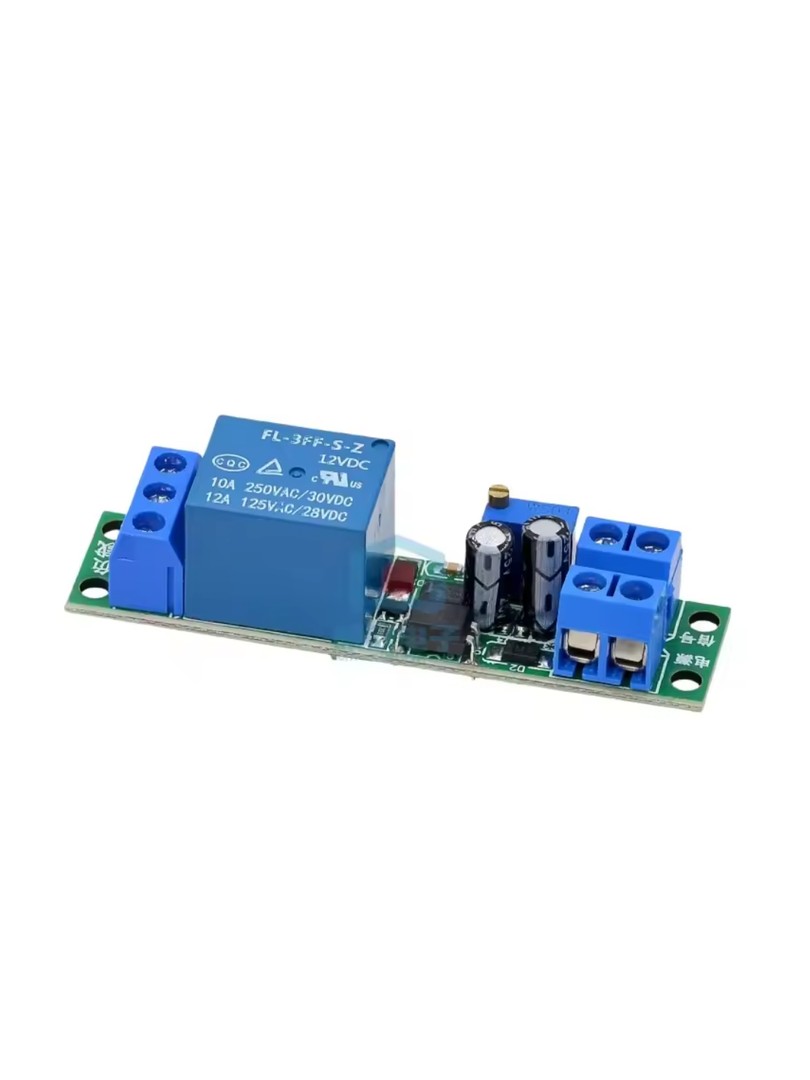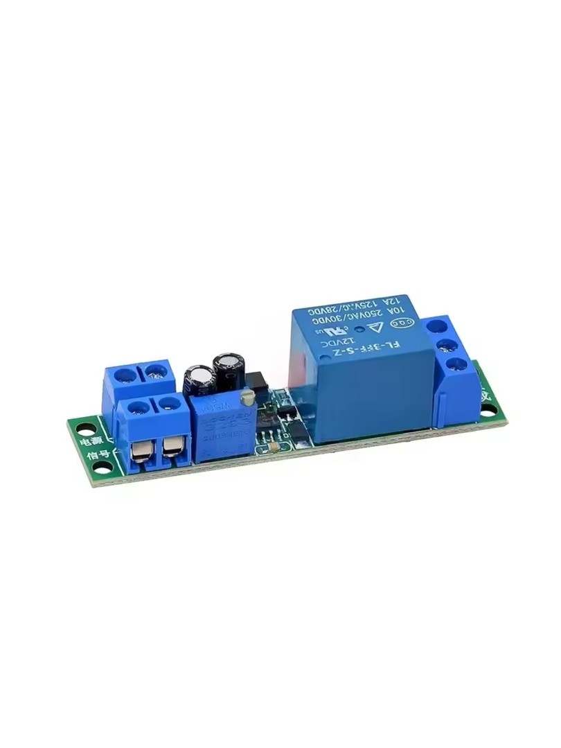 Po podłączeniu zasilania wyjście modułu pozostaje w stanie niskim (brak sygnału wyjściowego). Sygnał wyzwalający w postaci zbocza opadającego na wejściu optoizolatora inicjuje cykl czasowy. Natychmiast po wyzwoleniu wyjście przechodzi w stan wysoki. Po upływie nastawionego czasu opóźnienia wyjście automatycznie powraca do stanu niskiego. Czas opóźnienia zmienia się przez obrót wieloobrotowego potencjometru zgodnie ze wzorem T ≈ 1,1 × R × C, gdzie R to rezystancja, a C pojemność kondensatora czasowego.