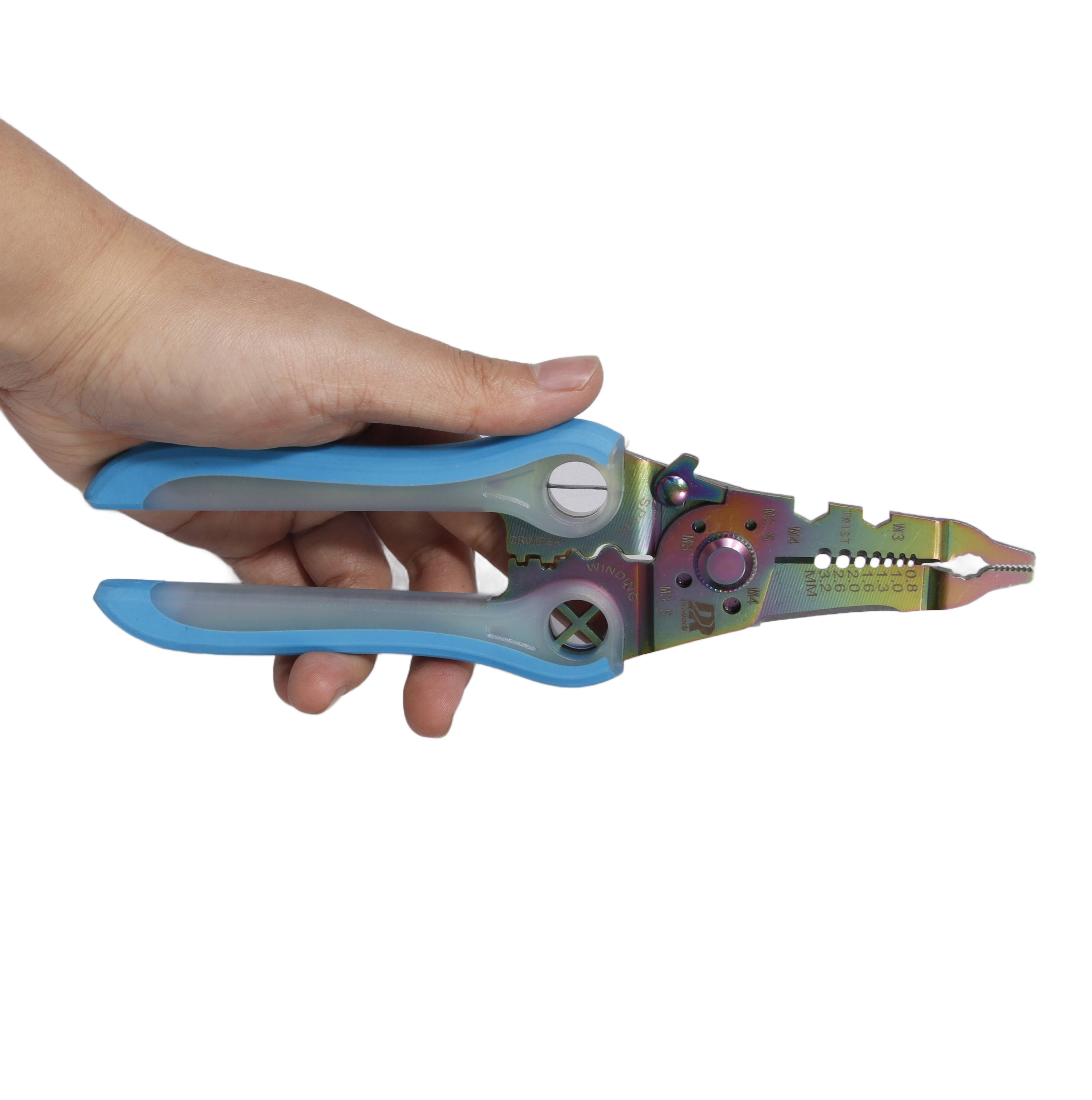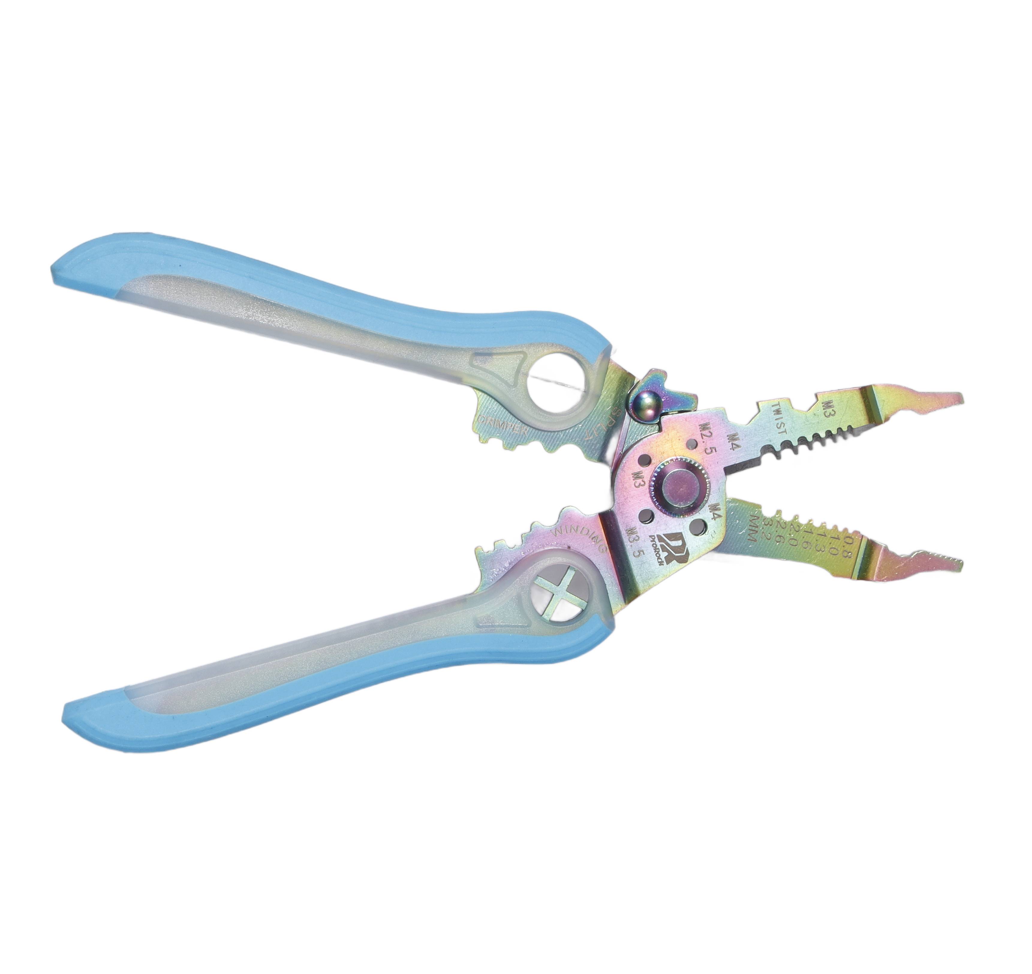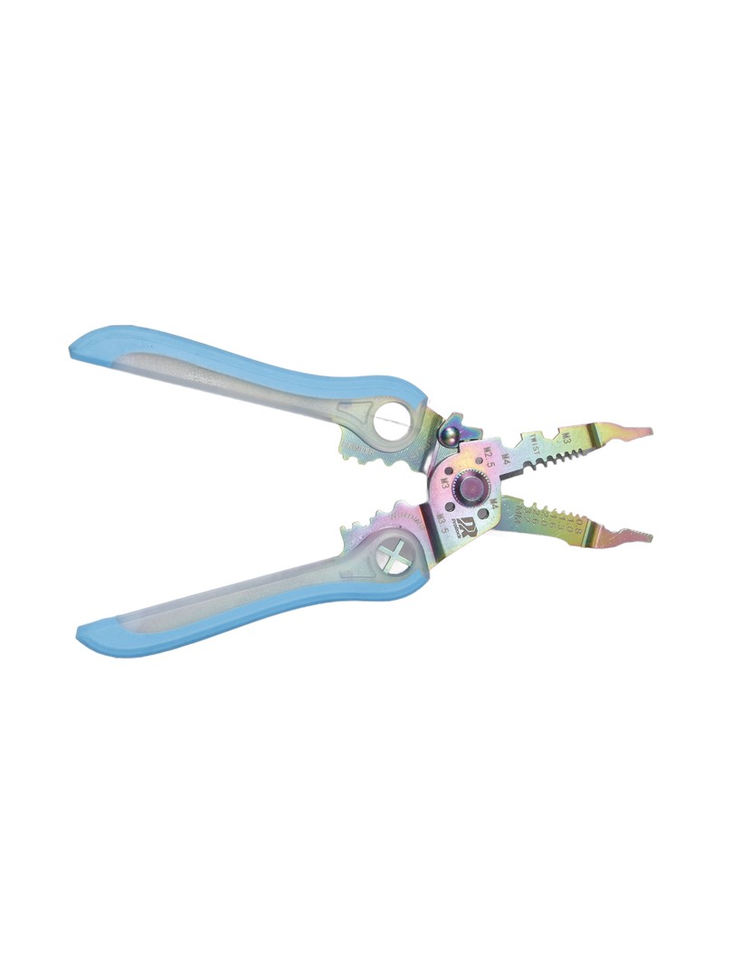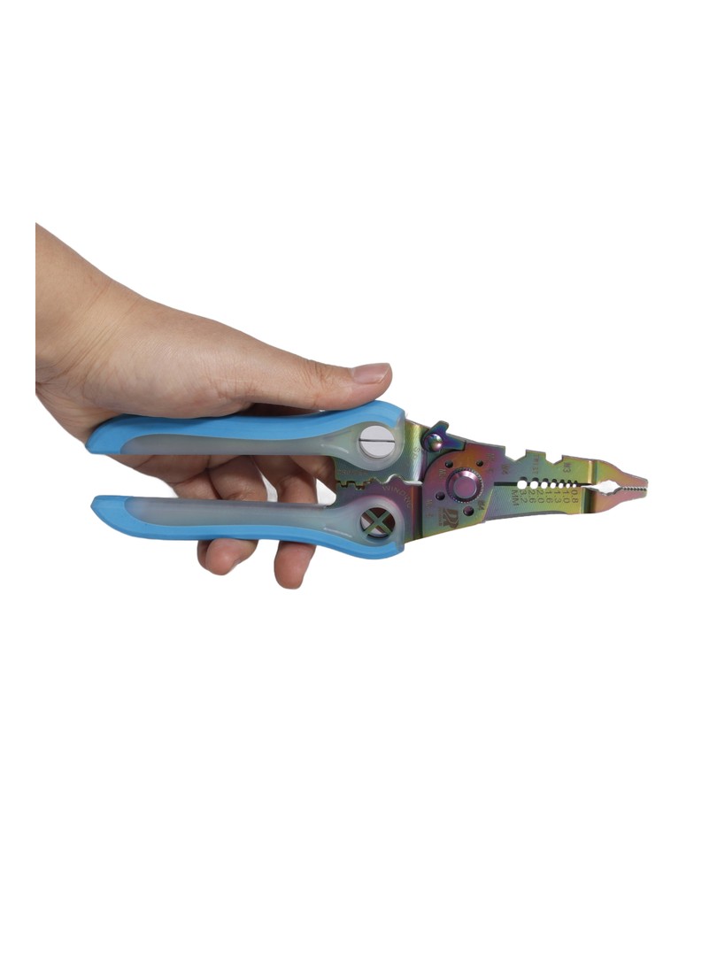 Profesjonalne narzędzie do ściągania izolacji charakteryzujące się eleganckim niebieskim wykończeniem rampy i wysokiej jakości konstrukcją ze stali nierdzewnej. Zaprojektowany z myślą o precyzyjnym zdejmowaniu izolacji z przewodów i zwiększonej ergonomii.