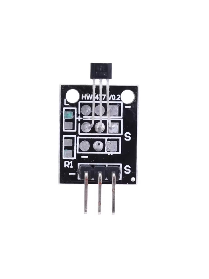 Moduł wykorzystuje zjawisko Halla do detekcji pola magnetycznego. Wyjście AO generuje napięcie odniesienia w stanie braku pola magnetycznego. Zbliżenie magnesu powoduje odchylenie napięcia wyjściowego w górę lub w dół w zależności od biegunowości i natężenia pola. Wartość napięcia jest odczytywana przez przetwornik analogowo-cyfrowy mikrokontrolera, co umożliwia ciągły pomiar względnej intensywności pola magnetycznego.