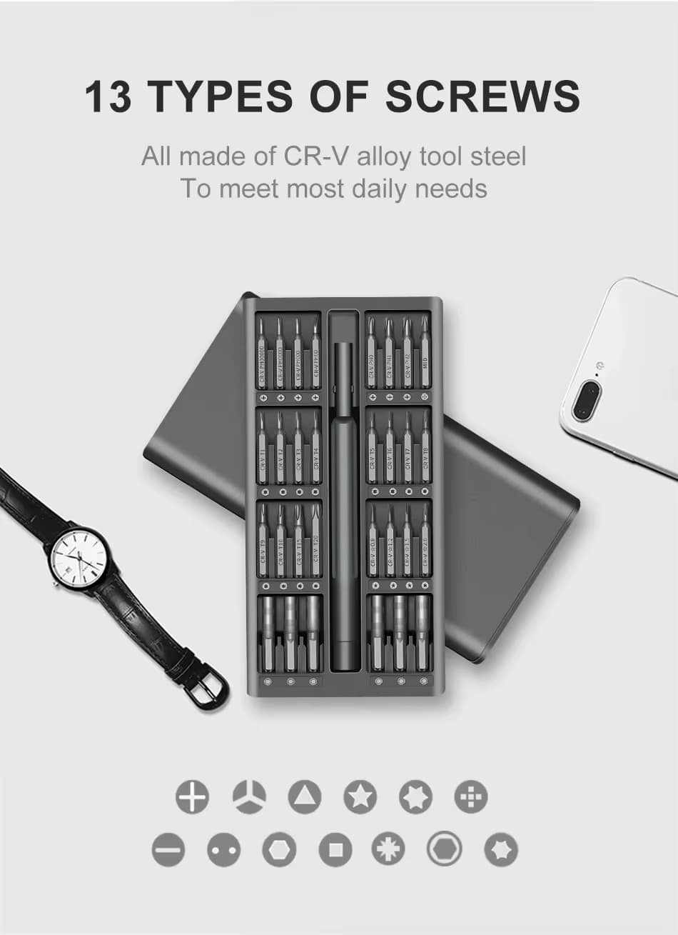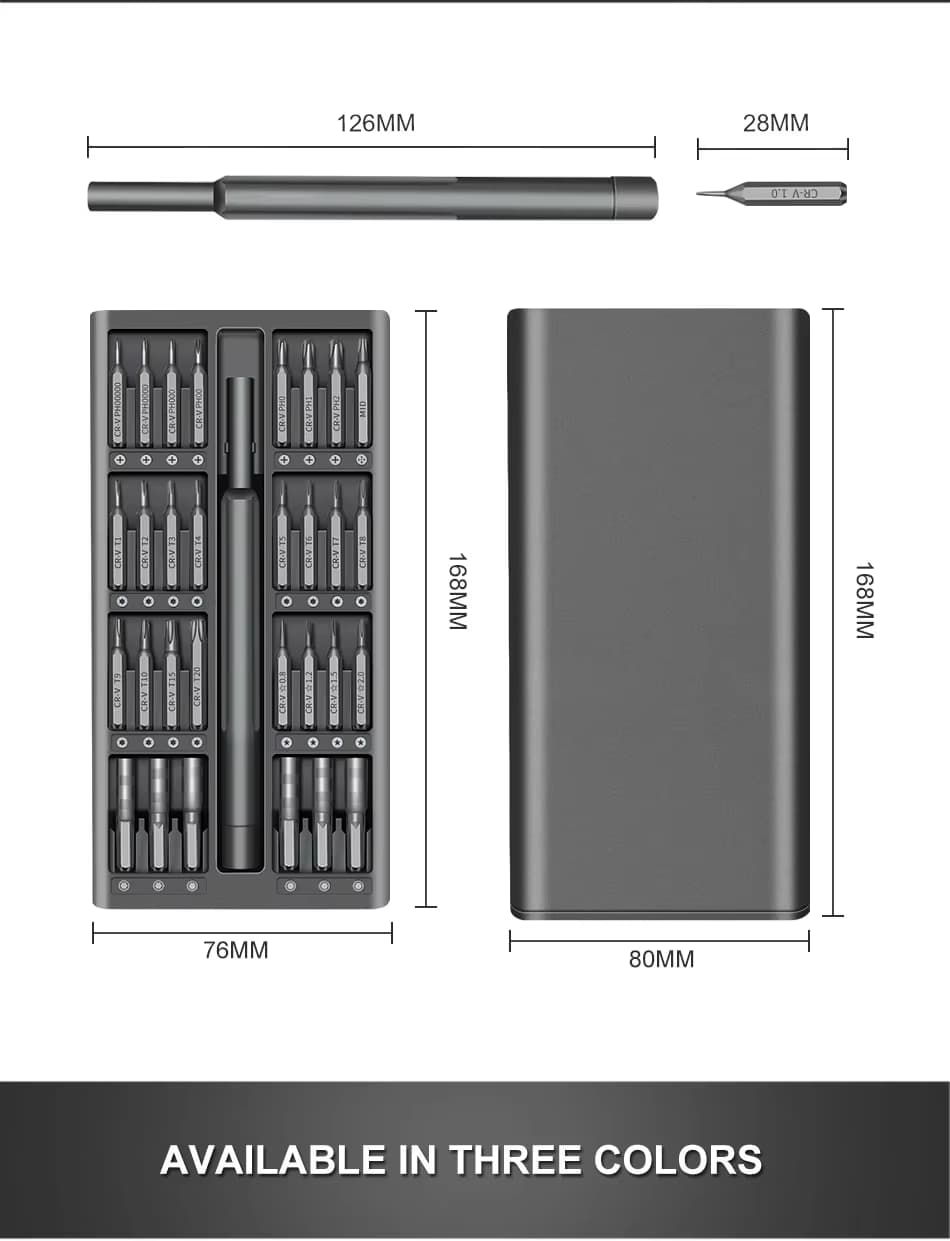 Set, 24-in-1, Gray to wszechstronny i kompaktowy zestaw wkrętaków precyzyjnych przeznaczony do szerokiego zakresu zadań, od naprawy elektroniki po konserwację w gospodarstwie domowym. Zestaw zawiera 24 wysokiej jakości bity i akcesoria, dzięki czemu jest niezbędnym narzędziem zarówno dla majsterkowiczów, techników, jak i profesjonalistów.