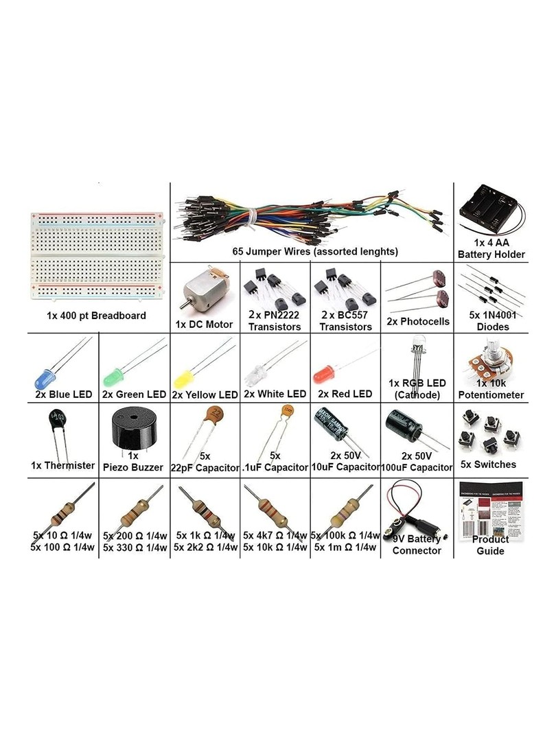 Wszystkie elementy są zorganizowane w z tworzywa plastikowym pojemniku, co ułatwia przechowywanie i transport. Zestaw wspiera naukę przez praktyczne eksperymentowanie z obwodami elektronicznymi.