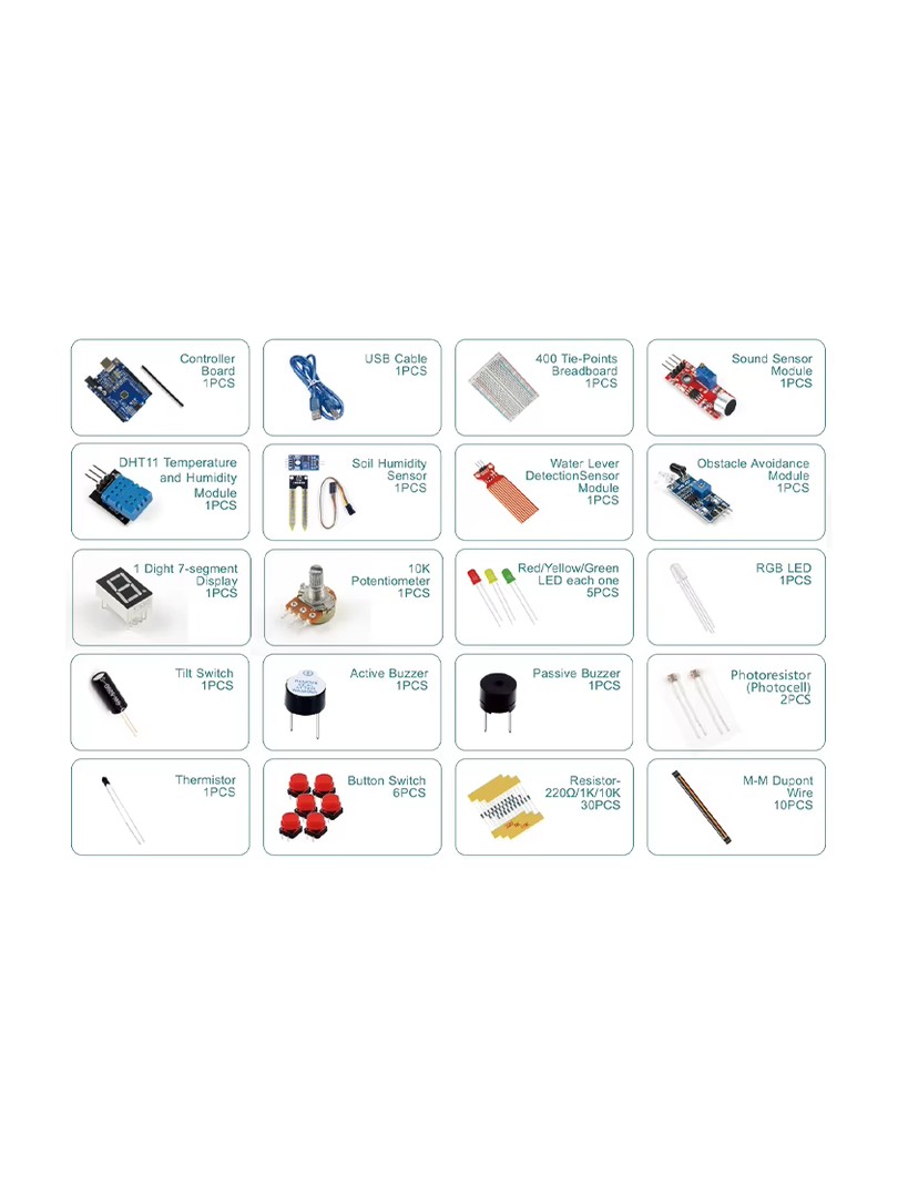 Produkt obejmuje szczegółowy przewodnik edukacyjny z ilustracjami połączeń, przykładami kodu oraz zestawem ponad dwudziestu eksperymentów krok po kroku, które ułatwiają zrozumienie podstawowych zagadnień z zakresu elektroniki i mikrokontrolerów.