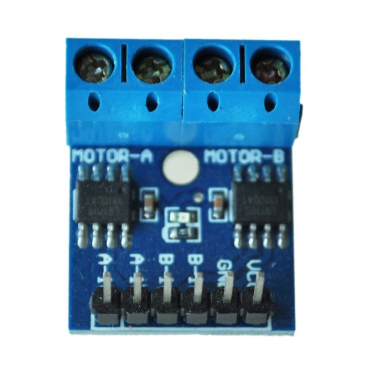 Każdy kanał modułu składa się z mostka H zbudowanego na bazie układu L9110S. Mostek H to układ czterech przełączników tranzystorowych umożliwiających zmianę kierunku przepływu prądu przez uzwojenia silnika. Sterowanie odbywa się poprzez dwa sygnały logiczne na kanał: ustawienie wysokiego poziomu na jednym wejściu i niskiego na drugim powoduje przepływ prądu w wybranym kierunku, co przekłada się na ruch silnika do przodu lub do tyłu. Zmiana kombinacji sygnałów sterujących zmienia kierunek przepływu prądu, a co za tym idzie — kierunek obrotu silnika. Modulacja szerokości impulsu sygnałów sterujących pozwala na płynną regulację prędkości obrotowej.